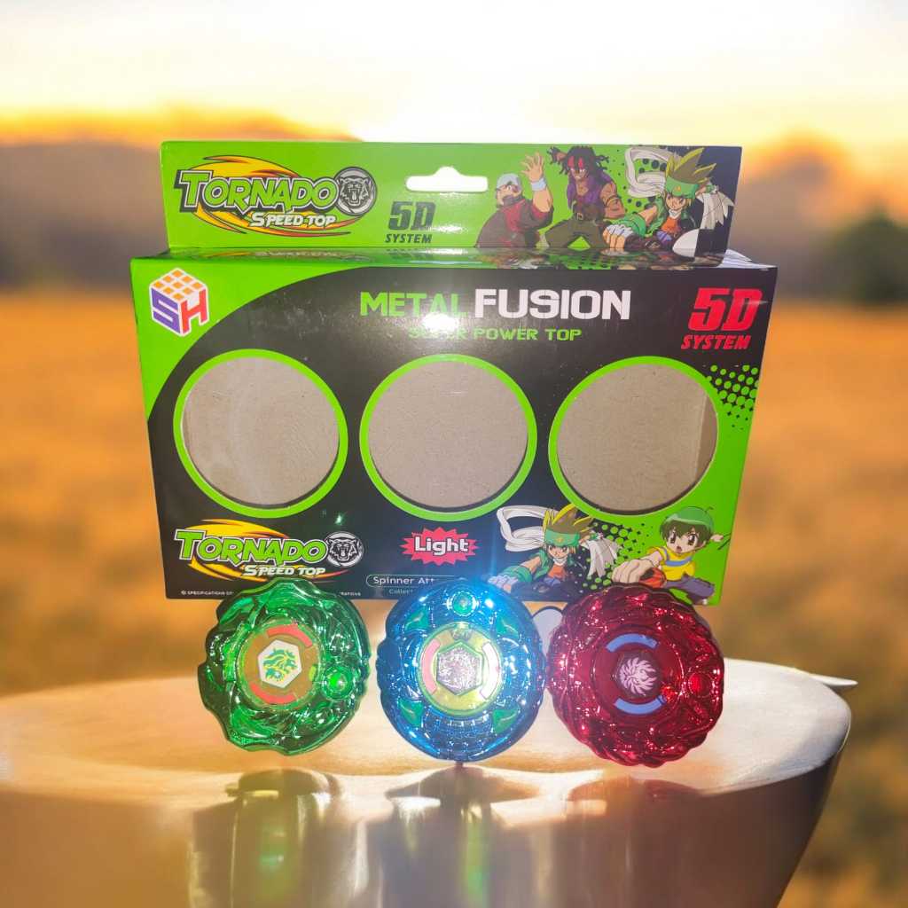 Kit 3 Beyblades Metal Fusion Tornado Speed Top com Led 3 BEYBLADES METAL FUSION TORNADO SPEED TOP Este kit com incríveis 3 Beyblades com led é o presente perfeito para qualquer criança que adora desafios emocionantes e batalhas épicas de Beyblade! Feito com material de metal de alta qualidade, este conjunto é uma ótima adição à coleção de qualquer fã de Beyblade. Ele inclui um lançador oque garante que as batalhas sejam intensas e emocionantes. Beyblades com cores vibrantes, leds e material de alta qualidade. ATENÇÃO: Não recomendado para crianças menores de 03 (três) anos de idade.