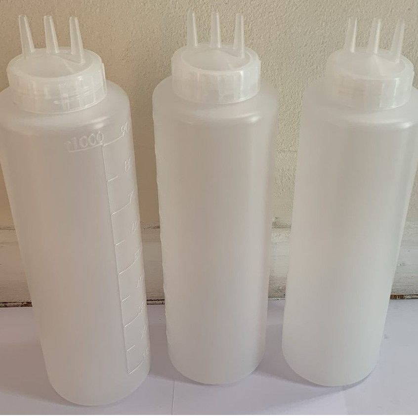 KIT 3 BISNAGAS PARA MOLHO PROFISSIONAL GRADUADA COM 3 BICOS 1LITRO Torne seu serviço mais eficiente com o frasco squeeze de três bicos. O design inovador do bico triplo oferece diferentes opções de apresentação e dispensa molhos em três vezes mais velocidade, ajudando a melhorar o tempo de servir. Feito de plástico transparente, o frasco facilita ver quando você está com pouco molho, permitindo que você reabasteça rapidamente e mantenha seu serviço funcionando perfeitamente. O plástico resistente também é incrivelmente robusto e durável, tornando-o a garrafa perfeita para uso em qualquer cozinha comercial movimentada. É muito adequado para cozinhar, bar, restaurante, artesanato, camping, churrasco, catering e muito mais