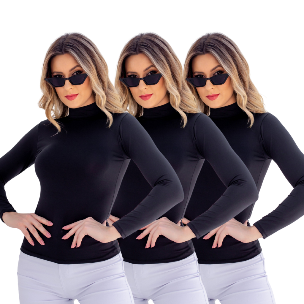 KIT 3 Blusa Cacharrel Feminina Gola Alta de Manga Longa - Cacharrel Lisa
