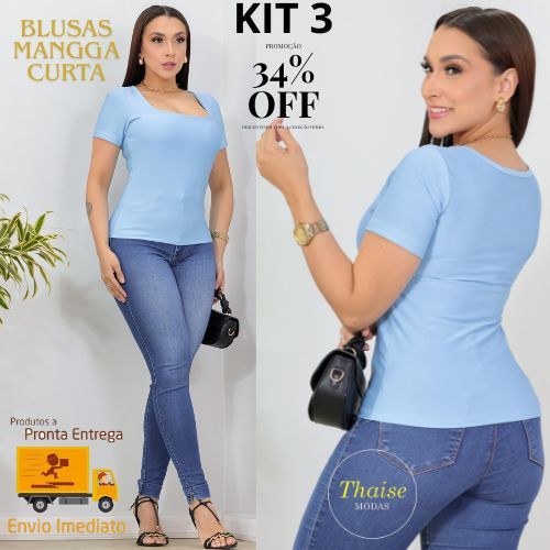 kit 3 Blusa Feminina Mnaga Curta Gola Quadrada Moda Casual 2025