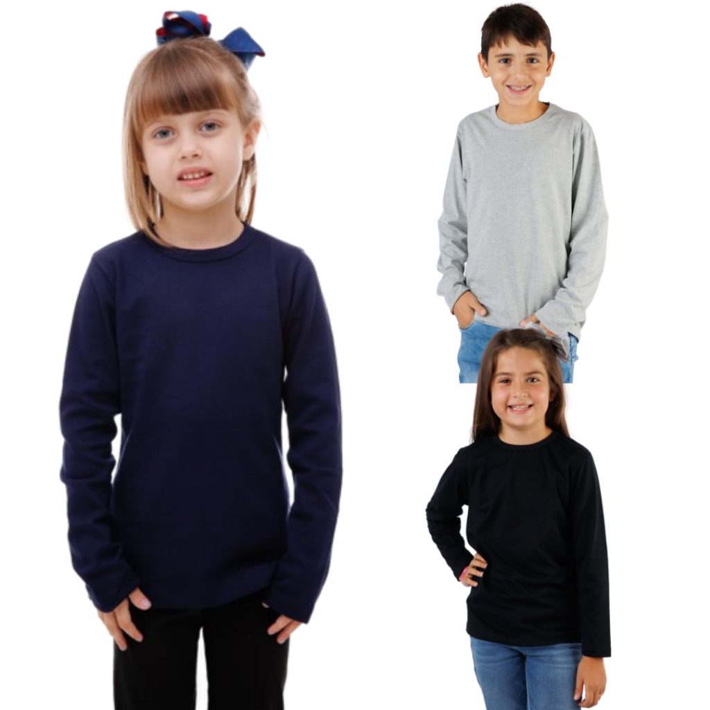 Kit 3 Blusas Infantil Manga Longa 100% Algodão 👕 Conforto para todos os dias! Características do produto: ✅ Kit com 3 peças ✅ Modelagem unissex (menina e menino) ✅ Confeccionada em meia malha 100% Algodão ✅ Tecido macio e confortável ✅ Ótimo caimento no corpo ✅ Ideal para uniforme escolar ✅ Cores e tamanhos conforme selecionado Você vai receber em sua casa: 📦 3 Blusas Infantil Manga Longa 📦 Cor e tamanho escolhidos no anúncio 📦 Produtos inspecionados e com garantia contra defeito de fábrica Recomendações de Uso: 👉 Confira a tabela de medidas na última foto do anúncio 👉 Não usar alvejante 👉 Não deixar de molho 👉 Não secar na secadora 👉 Lavar com cores similares e separar claras das escuras 👉 Verifique o endereço antes de finalizar a compra