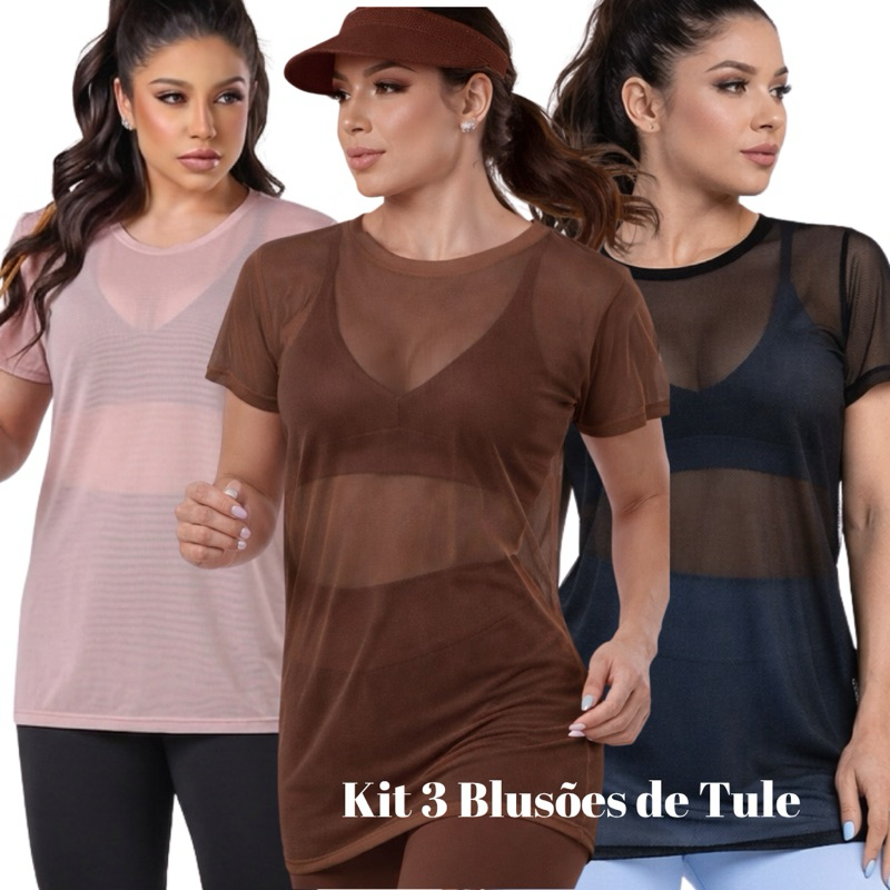 KIT 3 Blusa Tule Transparente Fitness Feminina Longa com Manga camisa tule camisetão Academia Conforto Verão