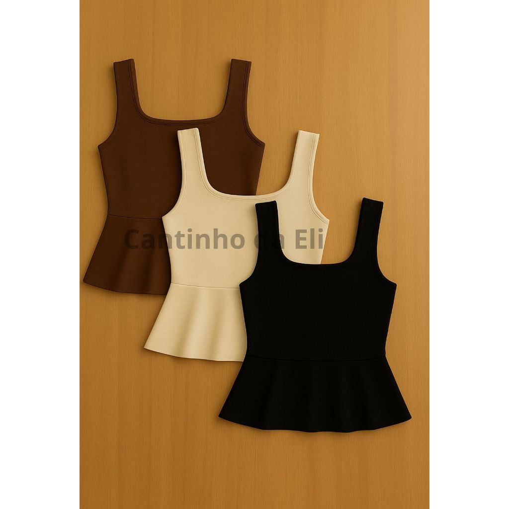 Kit 3 Blusas Feminina Regata Com Babado Peplum Modelagem Cintura Marcada