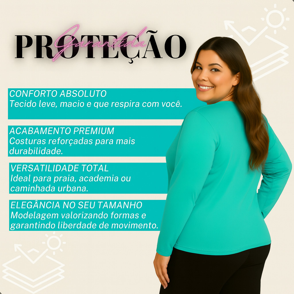 ________________________________________________ » CONTEÚDO DA EMBALAGEM 03 Camisetas Plus Size Femininas Proteção Solar UV+50 ________________________________________________ » CONHEÇA SUA PEÇA Proteção com estilo pra te acompanhar em qualquer plano! Com tecido leve, toque macio e caimento que valoriza, essa camiseta UV plus size garante conforto, liberdade e segurança — do treino ao passeio. ________________________________________________ » TABELA DE MEDIDAS G1 Comprimento: 67 cm Largura: 65 cm Indicação Peso: 75-85 kg G2 Comprimento: 72 cm Largura: 69 cm Indicação Peso: 85-95 kg G3 Comprimento: 74 cm Largura: 74 cm Indicação Peso: 110-125 kg ________________________________________________ » ESPECIFICAÇÕES Novo: Sim Pronta Entrega: Sim Material: Tecido tecnológico com proteção UV Cor: Disponível em diversos núcleos Composição: Poliéster e elastano ________________________________________________ » IMPORTANTE As medidas podem variar 2cm para mais ou para menos. A cor pode variar devido às diferenças nos lotes do tecido.