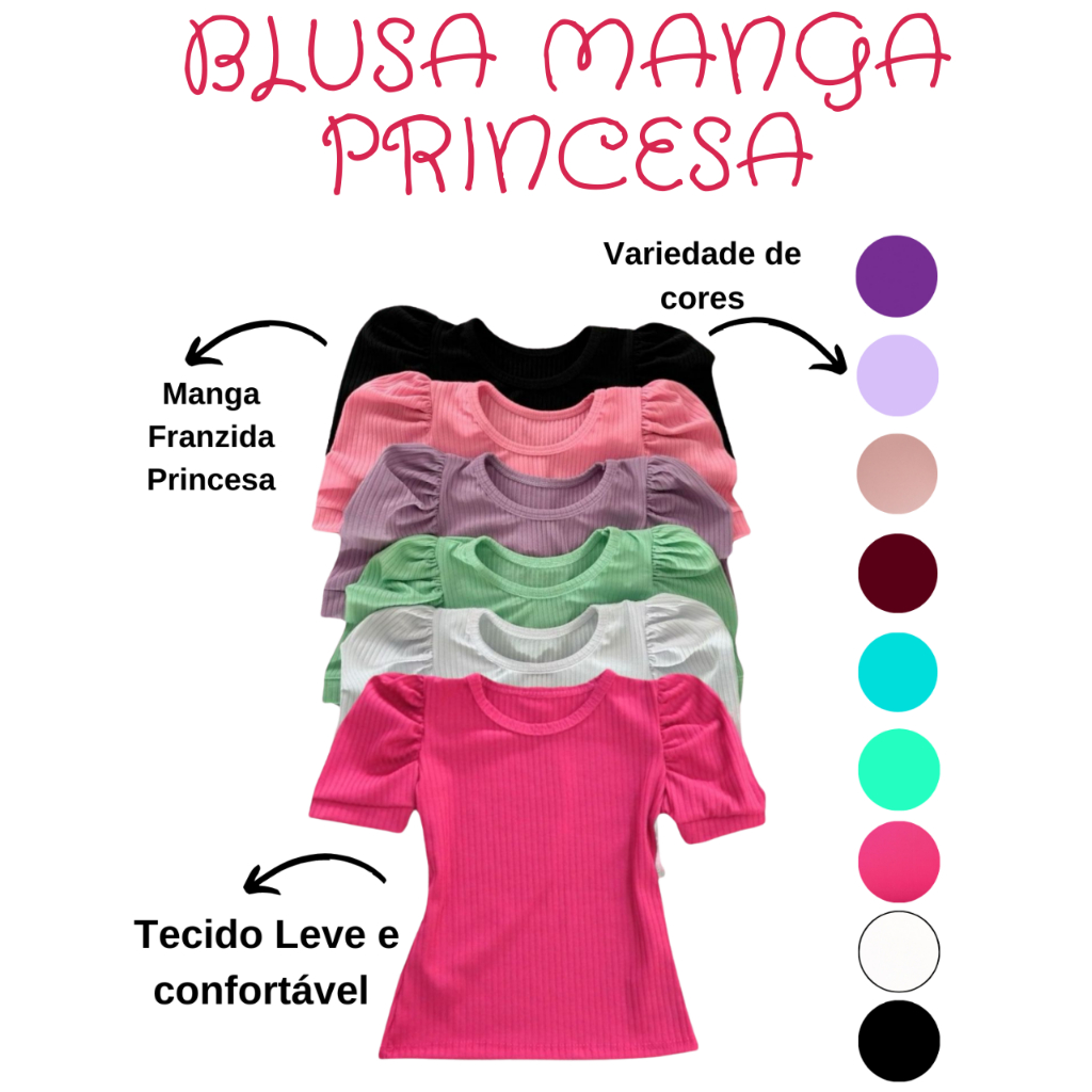 | Kit 3 Blusinhas Infantis Femininas Manga Princesa Canelada Cores Va... este produto | R$ 40,75 | 49% | 4.8/5 | — |