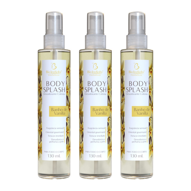 Kit com 3 Body Splash Bio Instinto Banho de Vanilla 130ml Fragrância doce e sensual Notas orientais gourmand Desodoriza e perfuma a pele Para todo o corpo