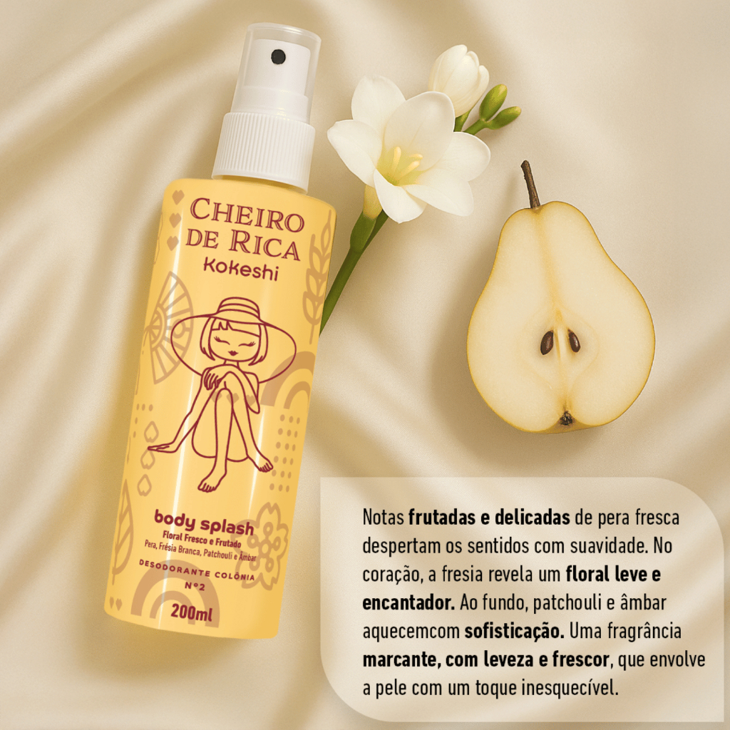 KIT 3 BODY SPLASH CHEIRO DE RICA KOKESHI FLORAL 3X200ML O Kit Cheiro de Rica reúne três body splashes sofisticados para quem busca frescor, sofisticação e charme em diferentes momentos do dia. -Cheiro de Rica Floral e Frutado:Com notas de pera, groselha preta, íris e jasmim, perfeito para eventos e ocasiões especiais. -Cheiro de Rica Floral Fresco e Frutado:Frescor delicado de frésia branca e um toque quente de patchouli, ideal para o dia a dia e pós-banho. -Cheiro de Rica Floral Intenso e Adocicado:Uma combinação envolvente de lichia, rosa turca e baunilha, perfeito para momentos especiais. Com o Kit Cheiro de Rica, você exala elegância e sofisticação em qualquer ocasião. O kit contém: 1 unid do Cheiro de Rica Floral e Frutado 200ml 1 unid do Cheiro de Rica Floral Fresco e Frutado 200ml 1 unid do Cheiro de Rica Floral Intenso e Adocicado 200ml MODO DE USAR Borrife sobre a pele após o banho ou sempre que quiser renovar seu frescor com um toque de sofisticação. Para uma fixação prolongada, aplique nos pontos de maior circulação sanguínea, como pulsos e pescoço.Perfuma a pele com leveza e sofisticação, combinando notas florais e frutadas em uma fórmula de rápida absorção. Vegano, livre de crueldade animal e ideal para trazer um toque de frescor e cuidado sempre que você quiser — do pós-banho aos momentos de autocuidado durante o dia. Floral e Frutado: PORTUGUÊS: Álcool Etílico 96°GL / 94°INPM 75,0000, Farnesol Plus (Farnesol / Glyceryl Laurate / Phenoxyethanol) 0,0500, Essência Voll Parfum Lovely Life 4,0000, Água Purificada 20,9500. Floral Fresco e Frutado: Composição (Português)Álcool Etílico, Água, Perfume, Fenoxietanol, Farnesol, Laurato de Glicerila, Alfa-Isometil Ionona, Citral, Citronelol, Geraniol, Hexil Cinamal, Hidroxicitronelal, Limoneno, Linalol. Floral Intenso e Adocicado: Composição (Português): Álcool Etílico, Água, Perfume, Fenoxietanol, Farnesol, Laurato de Glicerila, Citral, Limoneno, Linalol.