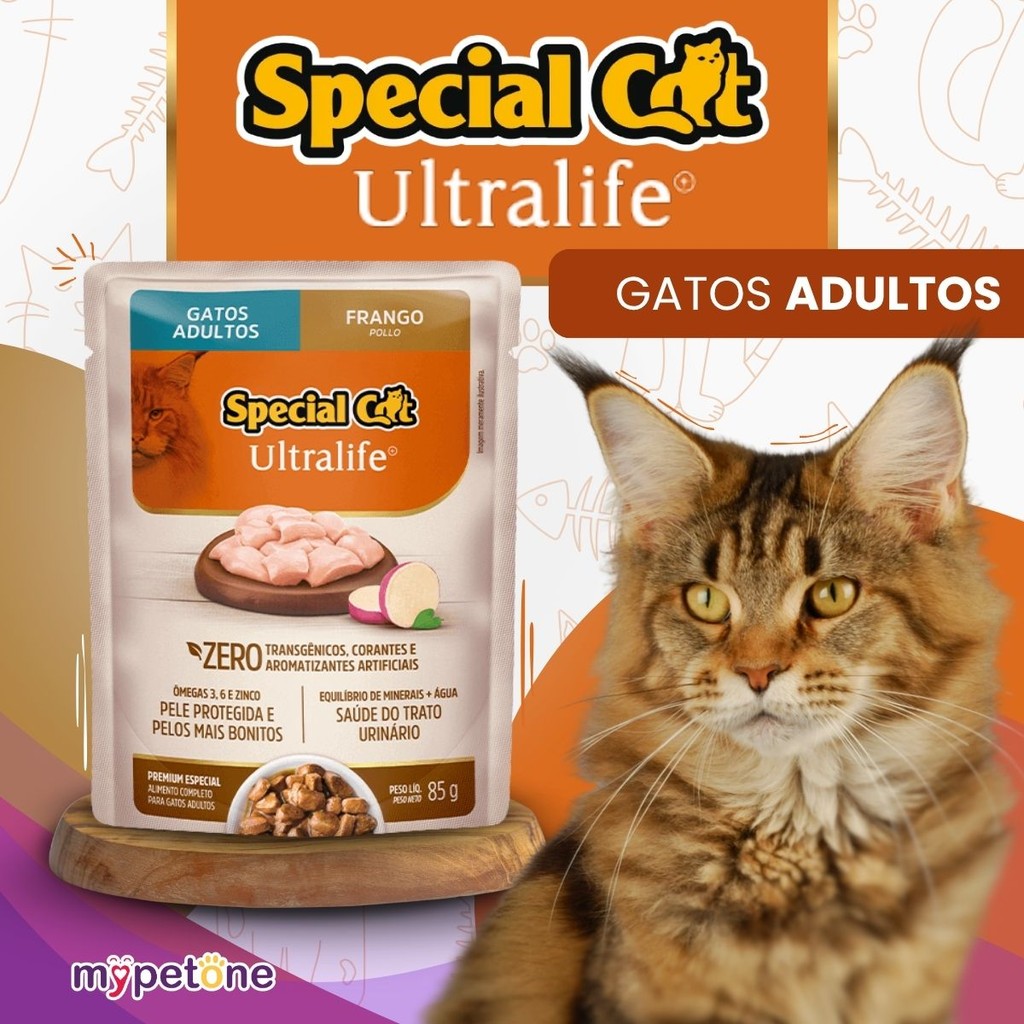 Special Cat Ultralife Sachê Adultos Sabor Frango – 85g Alimento úmido completo e balanceado para gatos adultos, com sabor delicioso de frango e fórmula que promove a saúde do trato urinário e o brilho da pelagem. Destaques Principais - Livre de corantes e aromatizantes artificiais - Com ômegas 3 e 6 + zinco orgânico: pele protegida e pelos mais bonitos - Saúde do trato urinário Análise Nutricional Garantida (por kg) Proteína Bruta: mín. 90 g Gordura (Extrato Etéreo): mín. 30 g Umidade: máx. 820 g Energia Metabolizável: 845 kcal Ingredientes Selecionados Carne de frango, carcaça de aves, miúdos de suíno, plasma sanguíneo desidratado de suíno, biomassa de microalgas e mix de vitaminas e minerais essenciais. Perfeito como única fonte de alimento ou misturado à ração seca, unindo sabor e nutrição em cada sachê.