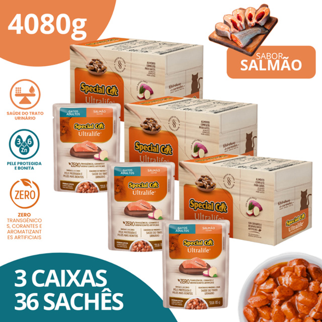| Kit 3 Caixa 12 Sachê Special Cat Ultralife Adultos Sabor Salmão 85g este produto | R$ 98,90 | 25% | 4.0/5 | — |