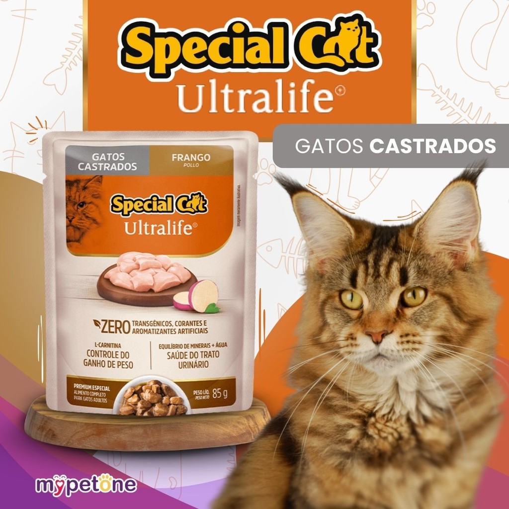 Special Cat Ultralife Sachê Castrados Sabor Frango – 85g Alimento úmido completo e balanceado, formulado especialmente para gatos castrados, com ingredientes selecionados que ajudam no controle do peso e na saúde do trato urinário. Destaques Principais - Sem corantes nem aromatizantes artificiais - L‑carnitina: controle do ganho de peso - Saúde do trato urinário - Textura macia e sabor irresistível Análise Nutricional Garantida (por kg) Proteína Bruta: mín. 100 g Gordura (Extrato Etéreo): mín. 20 g Umidade: máx. 820 g Energia Metabolizável: 777 kcal Ingredientes Selecionados Carne de frango, carcaça de aves, miúdos de suíno, plasma sanguíneo desidratado, gelatina, biomassa de microalgas, L‑carnitina, e mix de vitaminas e minerais essenciais. Perfeito para oferecer como única fonte de alimento ou misturado à ração seca, unindo nutrição e sabor em cada sachê.