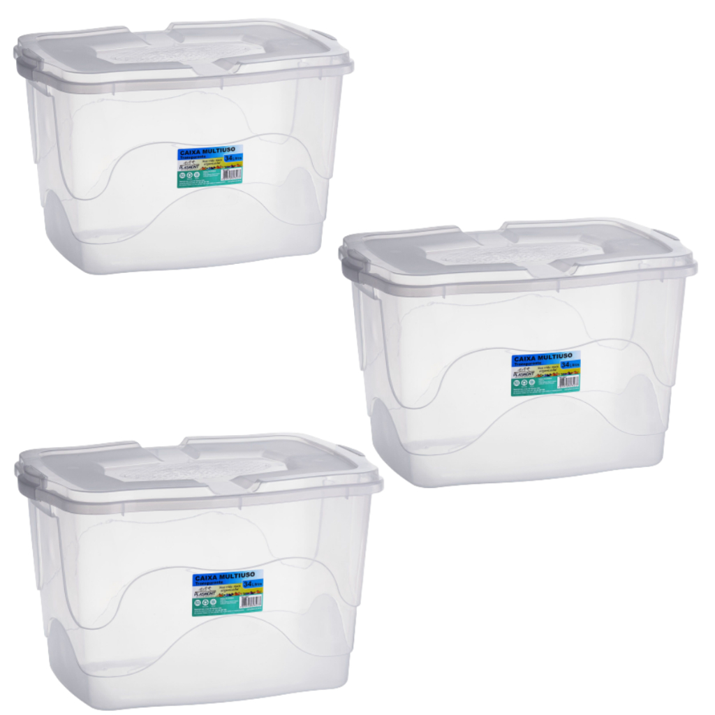 | Kit 3 Caixas 34 Litros Organizadora Cesto Multiuso Com Tampa Caixa ... este produto | R$ 141,15 | — | 4.7/5 | 303 |