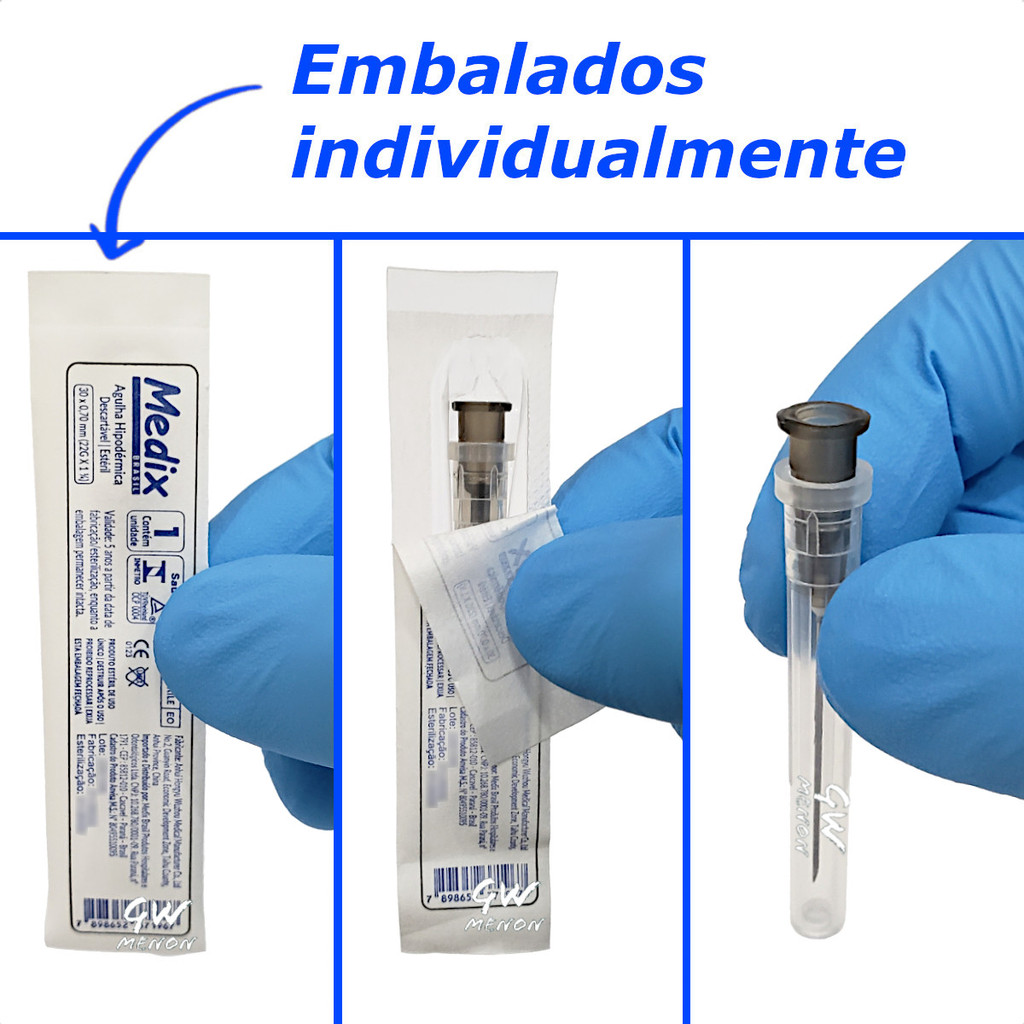 LOJA OFICIAL G. W. MENON Kit 3 Caixas cada uma contendo 100 agulhas hipodérmicas, totalizando 300 agulhas Medix tamanho 25 x 0.70mm ( 22G x 1) com canhão preto/cinza. Seu calibre de tamanho mediano a torna ideal para aplicações endovenosas e intramusculares. Produto esterelizado e descartável, com registro na Anvisa. PRODUTO ORIGINAL - PRONTA ENTREGA - ENVIO RÁPIDO PARA TODO BRASIL - NOTA FISCAL - TODAS AS FOTOS SÃO REAIS INSTRUÇÕES DE USO: Abra a embalagem unitária de forma asséptica. Com um movimento de rotação suave, adapte a seringa ao conector luer da agulha. Remova a tampa da agulha, aspire o fármaco para a seringa e execute a injeção utilizando uma técnica asséptica. Após a conclusão do procedimento, descarte a agulha em um recipiente adequado para materiais perfuro cortantes. Não reutilizar e não reprocessar. ESPECIFICAÇÕES TÉCNICAS: - Agulha hipodérmica estéril Medix com encaixe Luer Lock e Luer Slip. - Modelo com tampa protetora. - Kit contendo 300 agulhas. Cada unidade embalada individualmente. - Tamanho 25 x 0.70mm ( 22G x 1 ). - Cor do canhão preto. - Agulha fabricada em aço inoxidável. - Esterelização com Óxido de Etileno. - Lubrificada. - Bisel trifacetado - Produto estéril e descartável. - Uso único, não reutilizar nem reprocessar. - Aprovado pela Inmetro. - Registro na Anvisa: 80495510095.