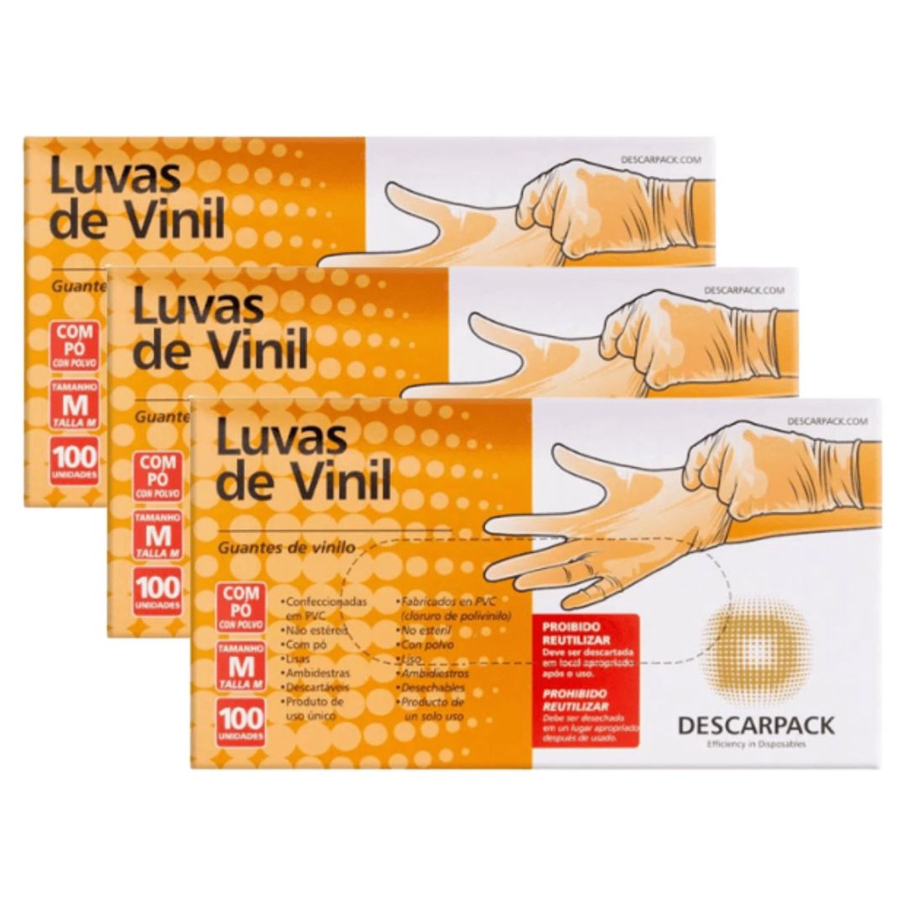 Kit 3 Caixas de Luvas de Vinil Sem Pó Atóxica Descarpack 100un