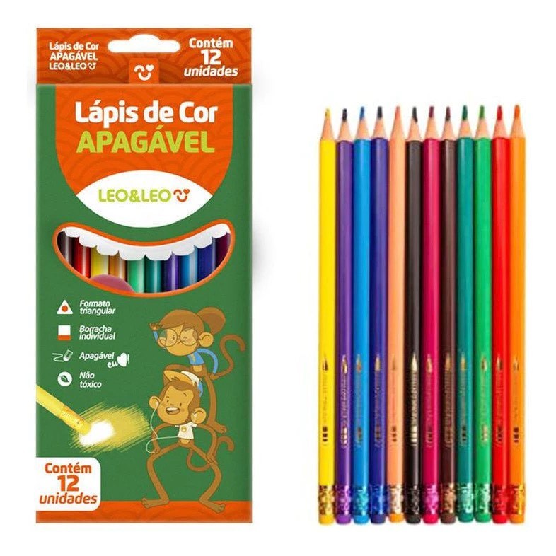 Kit 3 Caixas Lápis de Cor Apagável 12 Cores Triangular Com Borracha Escolar Infantil Leo&Leo