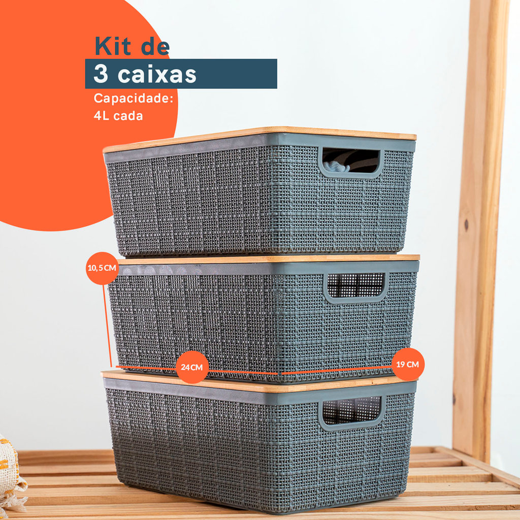 KIT 3 CAIXAS ORGANIZADORAS 4 LITROS CINZA C/ TAMPA BAMBU