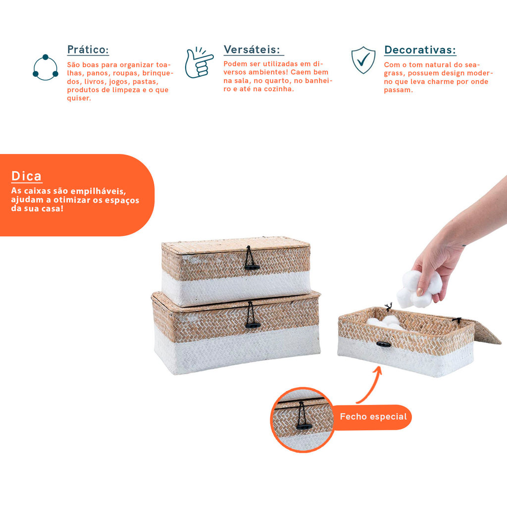 Kit 3 caixas organizadoras armazenamento decorativa palha seagrass - Oikos