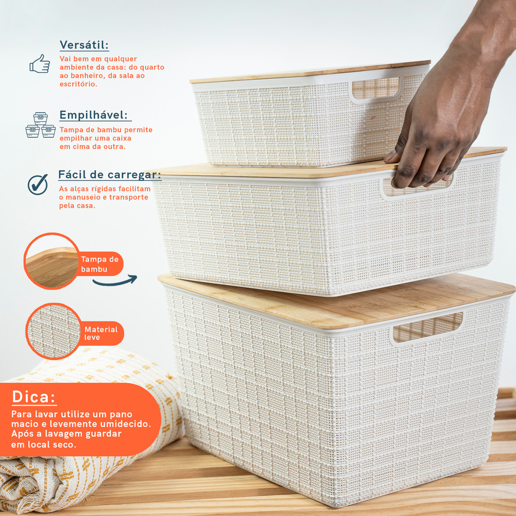 Kit 3 Caixas Organizadoras Branca C/ Tampa Bambu - P,M E G Oikos