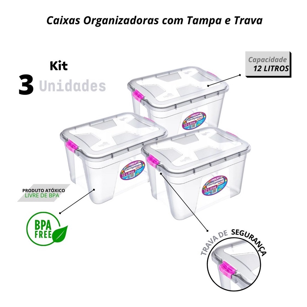 Kit 3 Caixas Organizadoras Transparente 12 Litros Com Travas de Segurança