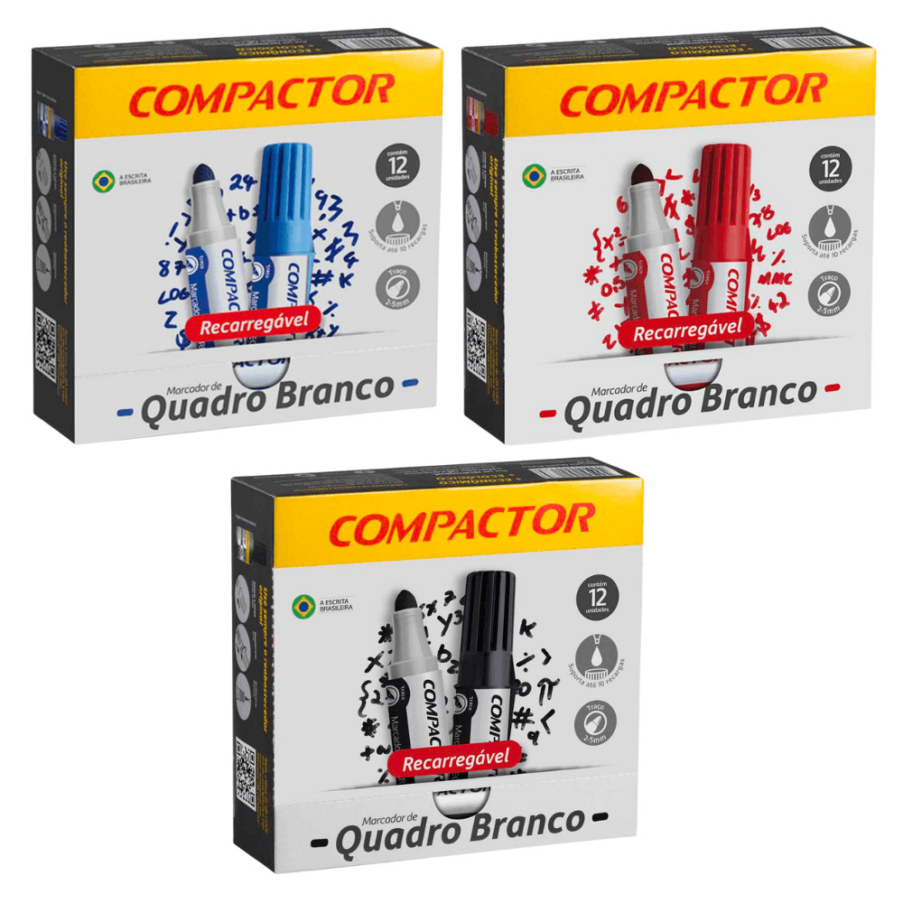 Kit 3 Caixas Pincel Marcador para Quadro Branco Recarregável Pt / Az / Vm 12 unidades Cada / Compactor integra a oferta da Shopee Brasil na subcategoria Marca-texto (de Papelaria) por R$ 246,83. Com avaliação de 5.0 de 5 estrelas e 1 unidade vendida, este produto se destaca pelo excelente custo-benefício.