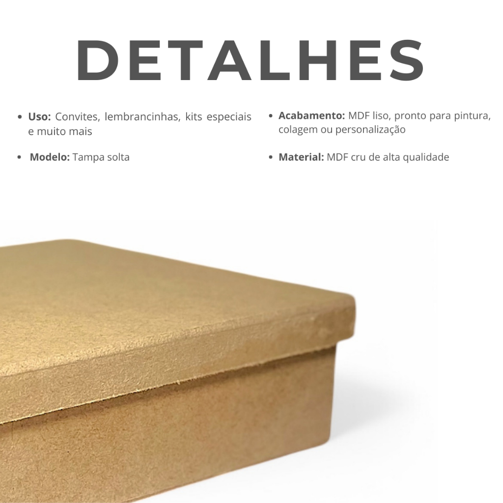 Caixinha de MDF 15x15x5 cm – Versatilidade e Charme em Cada Detalhe A Caixinha de MDF 15x15x5 cm é perfeita para quem busca uma solução prática, criativa e elegante para armazenar ou presentear. Com design simples e funcional, ela é ideal para lembrancinhas, embalagens personalizadas, artesanato ou organização de pequenos itens. Características do Produto: Material: MDF de alta qualidade, resistente e com ótimo acabamento para pintura ou personalização. Design: Formato compacto e tampa com encaixe preciso, ideal para proteger o conteúdo com segurança. Versatilidade: Pode ser usada como lembrança de festas, caixa de presente, embalagem de produtos artesanais, ou até como item decorativo. Dimensões: Comprimento: 15 cm Largura: 15 cm Altura: 5 cm Destaques: 📦 Tamanho ideal para pequenos objetos, doces, bijuterias ou kits personalizados. 📦 Acabamento suave, pronto para receber pintura podendo ser com spray ou tinta a base d'água 📦 Estrutura firme em MDF, garantindo durabilidade e segurança no uso. Atenção! ⚠️ Para garantir uma entrega segura, recomendamos a compra de até 2 Kits por pedido. Pedidos com grandes quantidades podem sofrer alteração no frete. ✅ Atendimento ágil e dedicado – Suporte personalizado para sua compra. ✅ Envio rápido e bem embalado – Proteção garantida para o transporte. ✅ Qualidade que se destaca – Caixa em MDF com acabamento limpo e pronto para personalização. Dê um toque especial aos seus projetos com a Caixinha de MDF 15x15x5 cm – Uma peça simples, funcional e cheia de possibilidades!