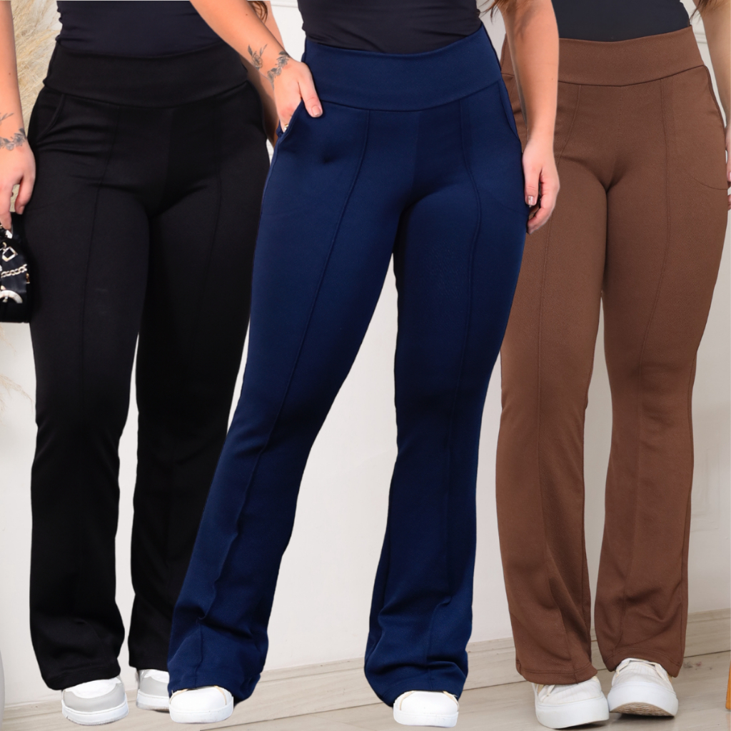 Kit 3 Calça Flare Feminina Calça Feminina Cintura Alta Bailarina Cores no Crepe de Malha