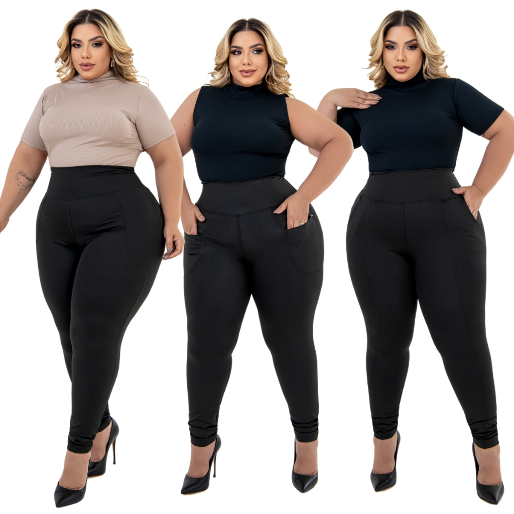 Kit 3 Calça Leg Feminina Bolso Ziper + Bolso Faca + Empina Bumbum Cós Alto