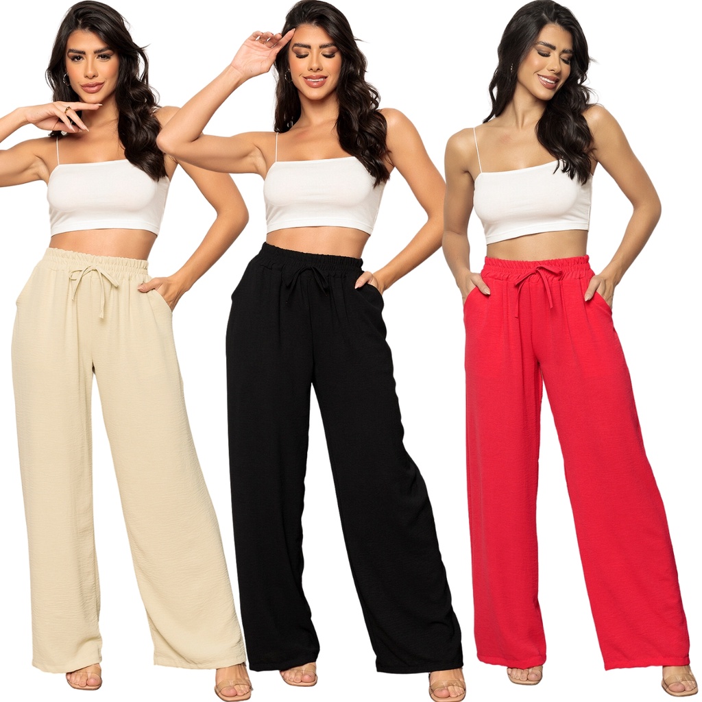 Kit 3 Calça Pantalona de Amarrar Feminina Crepe Duna Elastex