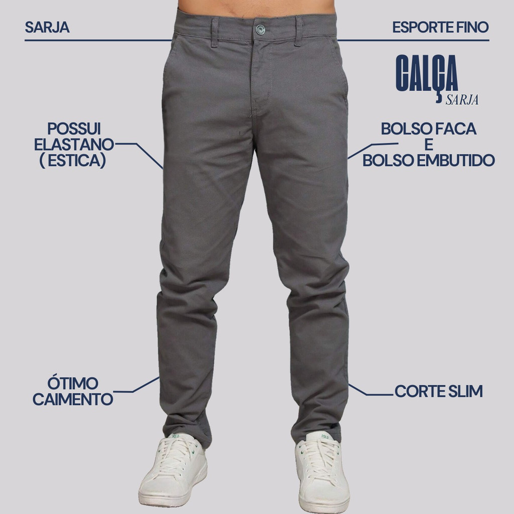 A Calça Sarja Masculina é a escolha ideal para homens que buscam conforto, estilo e versatilidade. Perfeita para diversas ocasiões, essa calça combina um design moderno com a praticidade que você precisa no dia a dia. Material: Confeccionada em sarja de alta qualidade, proporcionando durabilidade e conforto. A composição do tecido é respirável, ideal para uso em diferentes climas. Modelagem: Corte slim, que valoriza o corpo sem comprometer o conforto. A calça se ajusta perfeitamente, garantindo um visual elegante e descontraído. Bolsos frontais tipo faca: Práticos e discretos, perfeitos para armazenar itens essenciais como celular e carteira. Bolsos traseiros embutidos: Com fechamento em botão, oferecem segurança para seus pertences. Cintura: Cós com passantes para cinto, permitindo um ajuste personalizado e confortável. Fechamento: Zíper e botão frontal, garantindo praticidade e firmeza. Cores Disponíveis: Disponível em diversas opções de cores, permitindo que você escolha a que melhor se adapta ao seu estilo. A Calça Sarja é uma peça-chave no guarda-roupa masculino. Ela pode ser combinada com camisas, camisetas e até blazers, tornando-se uma opção versátil para o trabalho, encontros casuais ou passeios. O design moderno e os detalhes funcionais fazem dela uma escolha indispensável. Cuidados: Lavagem à mão ou em máquina em ciclo suave. Não utilizar alvejantes. Secar à sombra para preservar as cores e a qualidade do tecido. : Adquira a Calça Sarja Masculina e adicione uma peça essencial ao seu guarda-roupa. Conforto, estilo e funcionalidade em uma só calça! Ideal para o homem moderno que valoriza qualidade e praticidade. Não perca a oportunidade de garantir a sua!