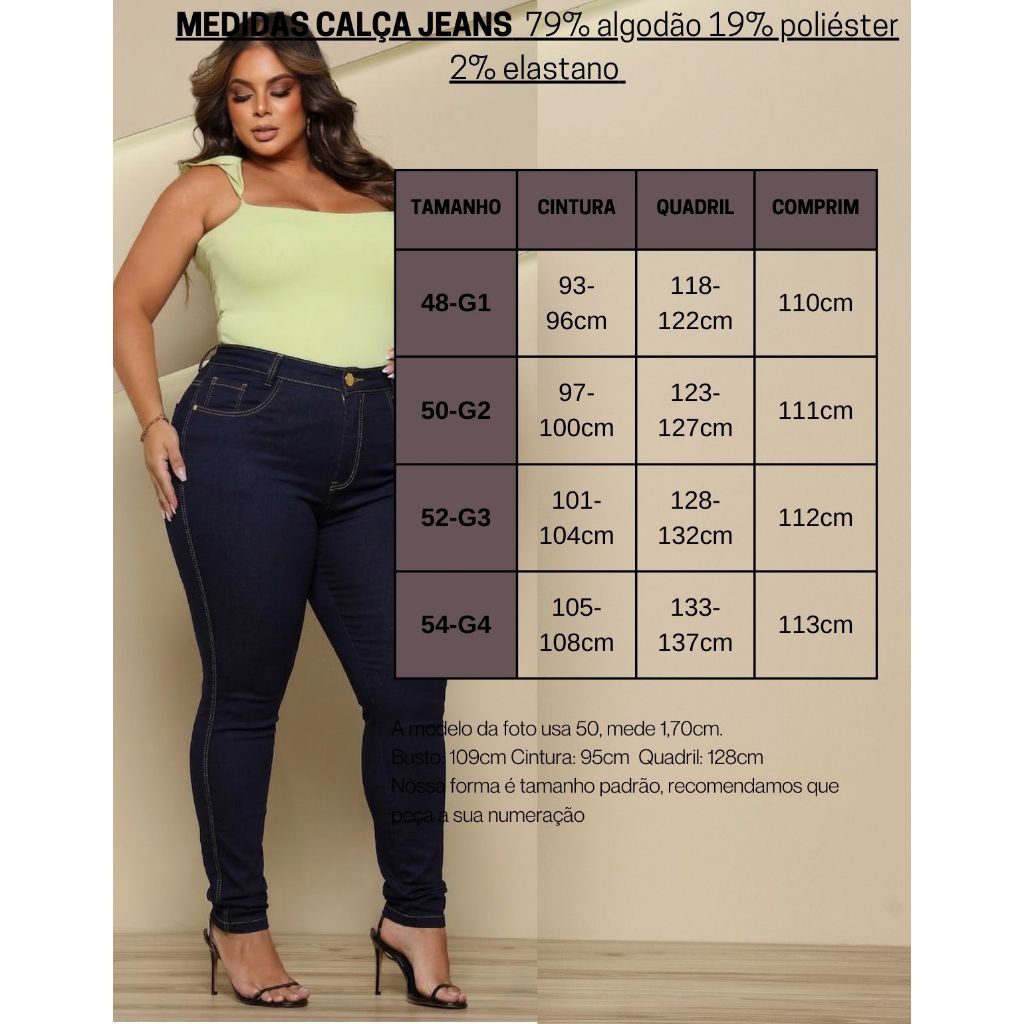 Kit 3 Calças Jeans Skinny Plus Size Cintura Alta Modeladora – Duones Jeans 79% algodão | 19% poliéster | 2% elastano Fabricação Duones — a melhor marca do mercado, unindo estilo, conforto e preço acessível. Modela o corpo, valoriza suas curvas e garante conforto no dia a dia. Destaques: • Cós alto que define a cintura • Modelagem empina bumbum • Kit com 3 peças: mais economia e versatilidade • Tecido com elastano: conforto e mobilidade • Caimento que valoriza o corpo sem apertar Modelagem: Veste o tamanho normal | Forma padrão | Caimento fiel ao corpo Qualidade: • Não laceia e não relaxa • Não junta pluma • Não desbota • Acabamento premium 📏 TABELA DE MEDIDAS 44 – | 75–82kg | 162–172cm | Cint. 85–88cm | Quadril 109–112cm | Comp. 104cm 46 – | 82–90kg | 165–175cm | Cint. 89–92cm | Quadril 113–117cm | Comp. 106cm 48 – G1 | 90–98kg | 160–170cm | Cint. 93–96cm | Quadril 118–122cm | Comp. 106cm 50 – G2 | 98–106kg | 162–172cm | Cint. 97–100cm | Quadril 123–127cm | Comp. 107cm 52 – G3 | 106–115kg | 165–175cm | Cint. 101–104cm | Quadril 128–132cm | Comp. 108cm 54 – G4 | 115–125kg | 168–178cm | Cint. 105–108cm | Quadril 133–137cm | Comp. 108cm Modelo da foto: veste 50 (G2) | Altura 1,70m Busto 109cm | Cintura 95cm | Quadril 128cm Nossa forma é tamanho padrão, recomendamos pedir sua numeração habitual. Dica: Se estiver em dúvida entre dois tamanhos, escolha pelo quadril, pois é a medida mais importante na calça.