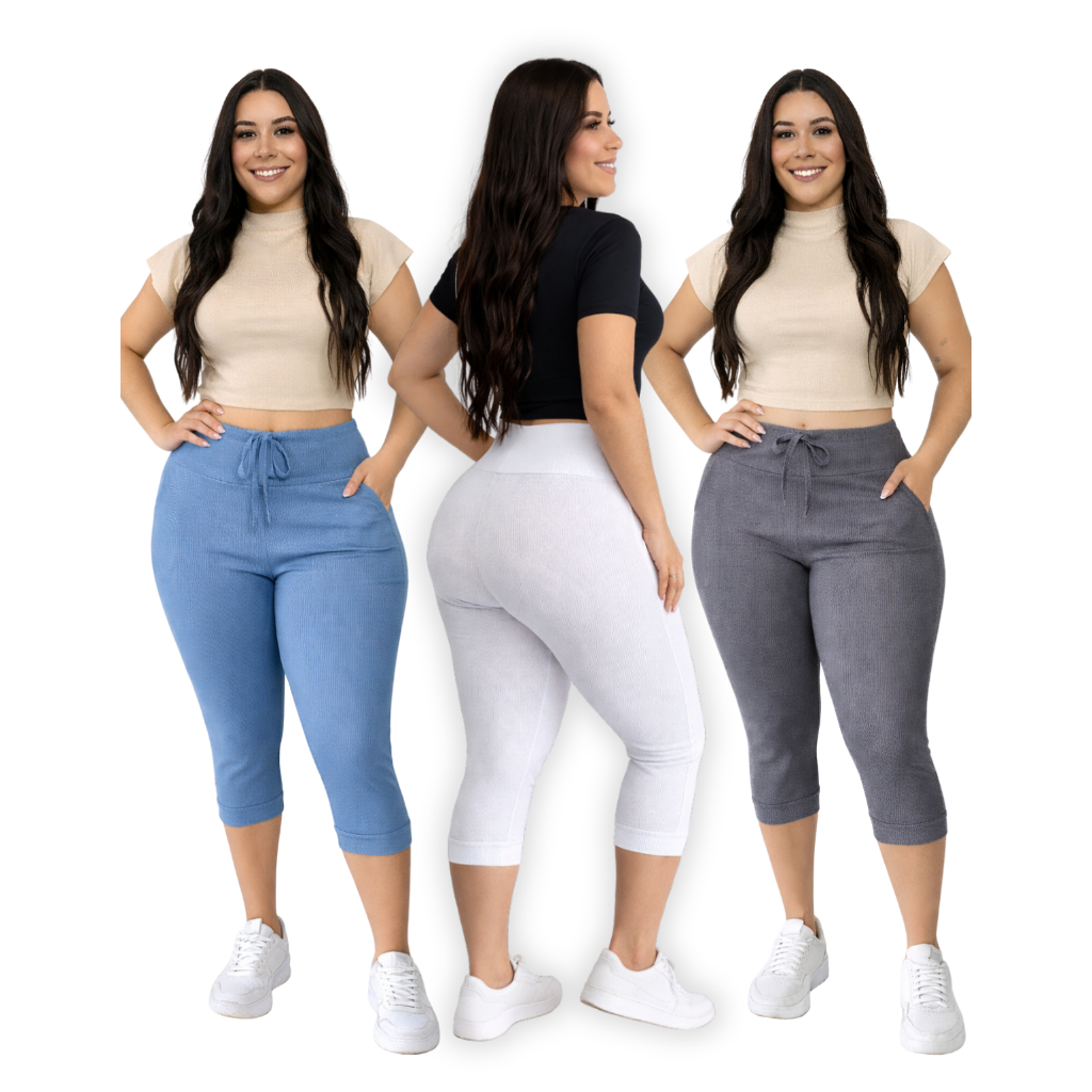 Kit 3 Calças capri feminina Cintura alta com elastano Corsário canelada