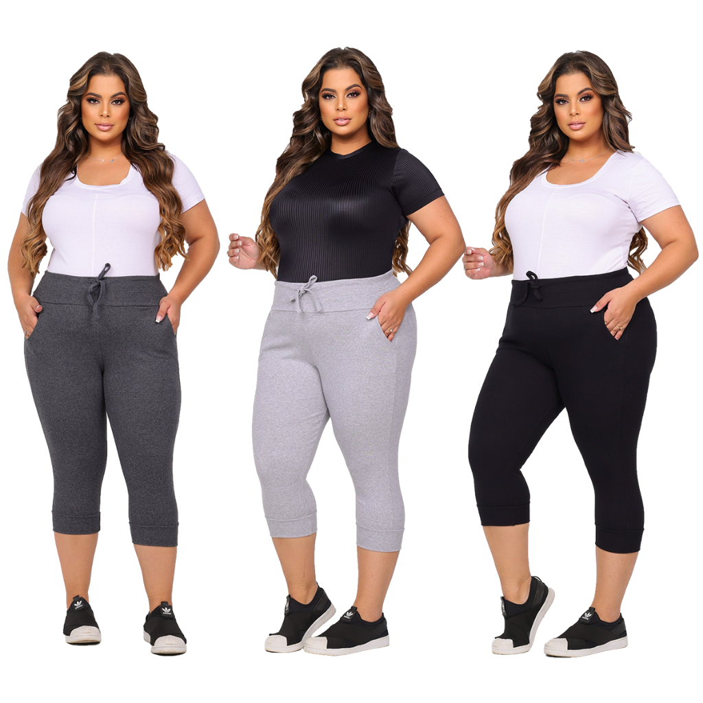 Kit 3 Calças Corsário Feminina Plus Size Cintura Alta | Algodão com Elastano | Carolina Moda