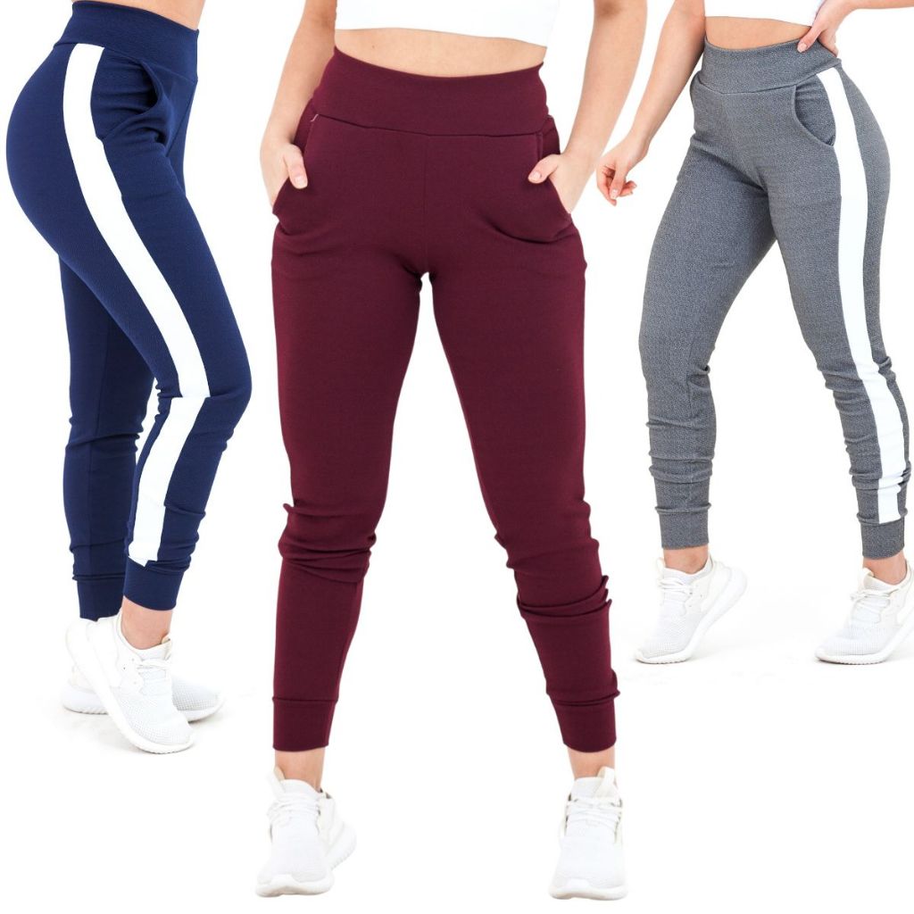 Kit 3 Calças Feminina Jogger Listrada Crepe Slm Fit Academia