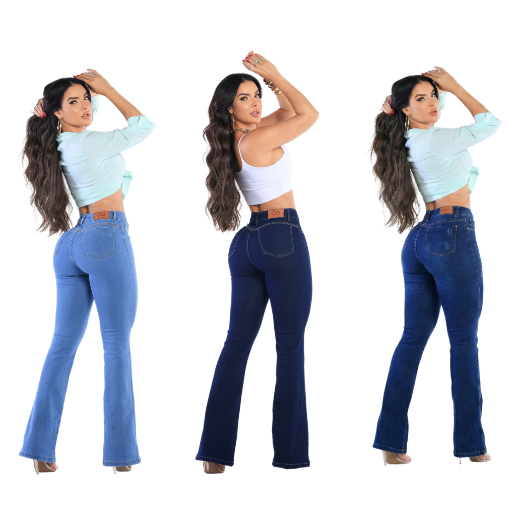 Kit 3 Calças Jeans Feminina Flare Levanta Bumbum Cos Alto Com Lycra Boca De Sino