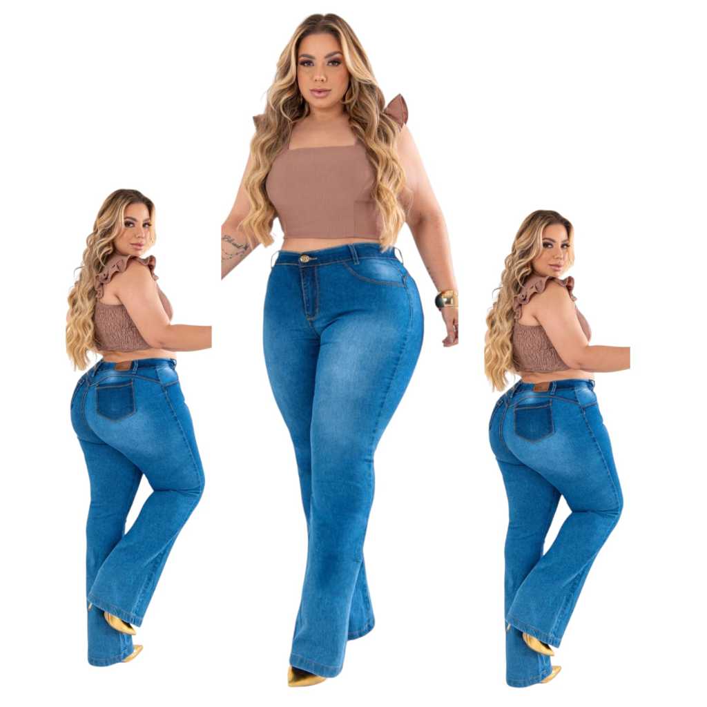 | KIT 3 CALÇAS JEANS FLARE PLUS SIZE COM LYCRA FEMININA CINTURA ALTA ... este produto | R$ 179,91 | 10% | 4.6/5 | 1 |