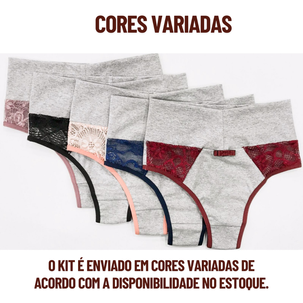Kit 3 Calcinhas de Algodão e Renda Cintura Alta Cós Alto