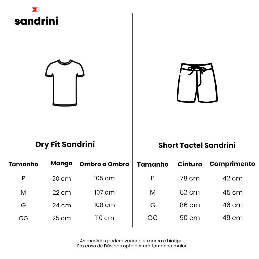 Kit 3 Camisas Regatas Dry-fit Sandrini + 2 Shorts Tactel | REF: 2355 / 77046 Sobre o item O Kit Sandrini Dry-Fit com 3 camisas regatas + 2 shorts foi pensado para quem busca secagem rápida, leveza e versatilidade nos treinos. O tecido em poliéster com elastano entrega toque macio e confortável, com visual moderno para academia, fitness, corridas e esportes em geral. Por ser um kit, vai com cores sortidas, sem opção de escolha, conforme disponibilidade do lote e das variações do anúncio. Especificações técnicas Produto: Kit 3 Camisas Regatas + 2 Shorts Modelo: Dry-Fit Material principal: Poliéster e Elastano Cores: O Kit possui as opções: Preto, Cinza e Azul marinho (Lembrando que não há opção de escolha na composição das cores que serão enviadas, o kit será montado de acordo com a disponibilidade em estoque no momento do envio) Benefícios e cuidados Benefícios: A modelagem com tecido elástico ajuda na mobilidade durante exercícios, enquanto a secagem rápida contribui para manter a sensação de conforto ao longo do treino. O conjunto é uma opção prática para montar looks esportivos completos, alternar combinações e manter a rotina com peças leves e versáteis. Cuidados: Para melhor conservação, lave com cores similares, prefira água fria e sabão neutro, e evite alvejantes. Seque à sombra e não utilize ferro muito quente, preservando a elasticidade e o caimento do material. Tabela de medidas Camisa Regata P: Manga 20 cm | Ombro a Ombro 105 cm M: Manga 22 cm | Ombro a Ombro 107 cm G: Manga 24 cm | Ombro a Ombro 108 cm GG: Manga 25 cm | Ombro a Ombro 110 cm Shorts P: Cintura 78 cm | Comprimento 42 cm M: Cintura 82 cm | Comprimento 45 cm G: Cintura 86 cm | Comprimento 46 cm GG: Cintura 90 cm | Comprimento 49 cm Dica de medição: compare as medidas acima com uma peça sua que vista bem, medindo em superfície plana (cintura/ombro e comprimento). Política de devolução Caso o produto não sirva ou não atenda sua expectativa, a devolução pode ser solicitada dentro do prazo da plataforma, mantendo as peças sem uso, com etiquetas e na embalagem original. FAQ O produto é original? Sim, todos os produtos são 100% originais. Acompanha nota fiscal? Sim, todos os produtos com nota fiscal e garantia de procedência. Posso trocar minha escolha depois de finalizar a compra? Não é possível alterar após a compra. Produtos são enviados conforme selecionado. As cores do kit podem ser escolhidas? Não. O kit é enviado com cores sortidas, sem opção de escolha. É indicado para corrida e academia? Sim. O conjunto Dry-Fit é leve e versátil para treinos, academia, corridas e esportes. Sobre a Sandrini A Sandrini é referência desde 2011 em moda masculina, esportes e saúde, com foco em qualidade, conforto e satisfação total. Atuamos com tênis, cuecas, shorts/bermudas, camisetas e itens de esporte (bolas e chuteiras), além de saúde (meias de compressão e bota ortopédica). Reconhecida pela excelência no atendimento e pela variedade, fomos premiados em 2022 como a maior loja do marketplace. Imagens ilustrativas. As cores podem variar de acordo com o lote ou sua tela/monitor.