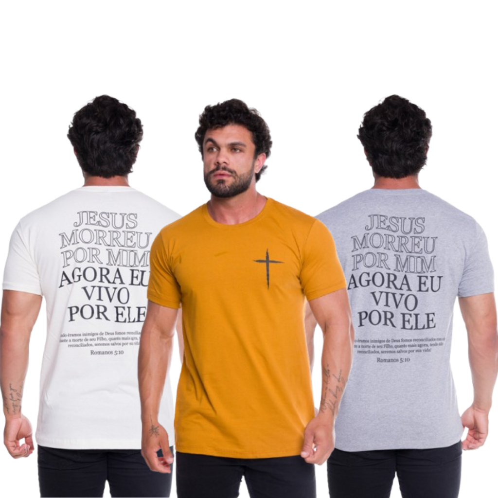 | Kit 3 Camisetas CRISTÃ JESUS MORREU POR MIM Básica 100% Algodão este produto | R$ 79,90 | 27% | 4.9/5 | 5 |