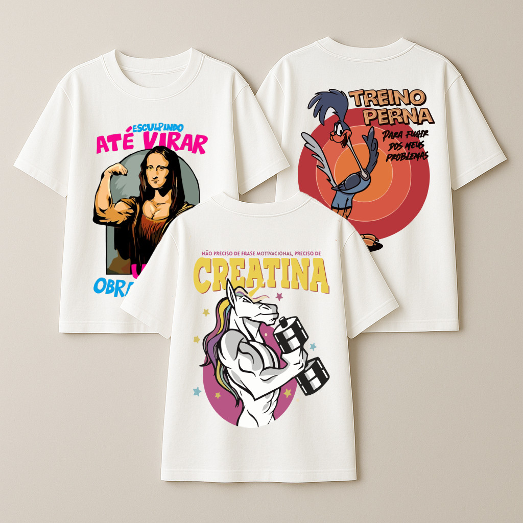 ⭐ 4,9/5 de avaliação – +115 unidades vendidas! ⭐ Garanta já o seu kit com estampas exclusivas! Kit 3 Camisetas Oversized Feminina Academia ️️ Estilo, conforto e bom humor para seus treinos e seu dia a dia! O kit vem com 3 camisetas com estampas criativas que unem atitude e personalidade para quem quer se destacar com autenticidade. Estampas do Kit: 1️⃣ Monalisa – “Esculpindo até virar uma obra de arte” 2️⃣ Papa-Léguas – “Treino perna para fugir dos meus problemas” ️ 3️⃣ Unicórnio – “Não preciso de frase motivacional, preciso de creatina” Detalhes do Produto: Confeccionadas em malha 100% algodão Toque macio, leve e respirável Modelagem oversized com caimento solto Gola reforçada e costuras resistentes Estilo perfeito para a academia ou look casual Tabela de Medidas (aproximadas): P: Altura 67cm | Largura 52cm M: Altura 68cm | Largura 54cm G: Altura 70cm | Largura 57cm GG: Altura 73cm | Largura 58cm (Variação de até 2cm) Cuidados: Lavar do avesso Usar sabão neutro Não usar alvejante Secar à sombra Passar com ferro em temperatura média (não passar sobre a estampa) Envio imediato! Garanta já seu kit com 3 camisetas e treine com mais atitude e personalidade! Ficou com alguma dúvida? Chame no chat, será um prazer te ajudar!