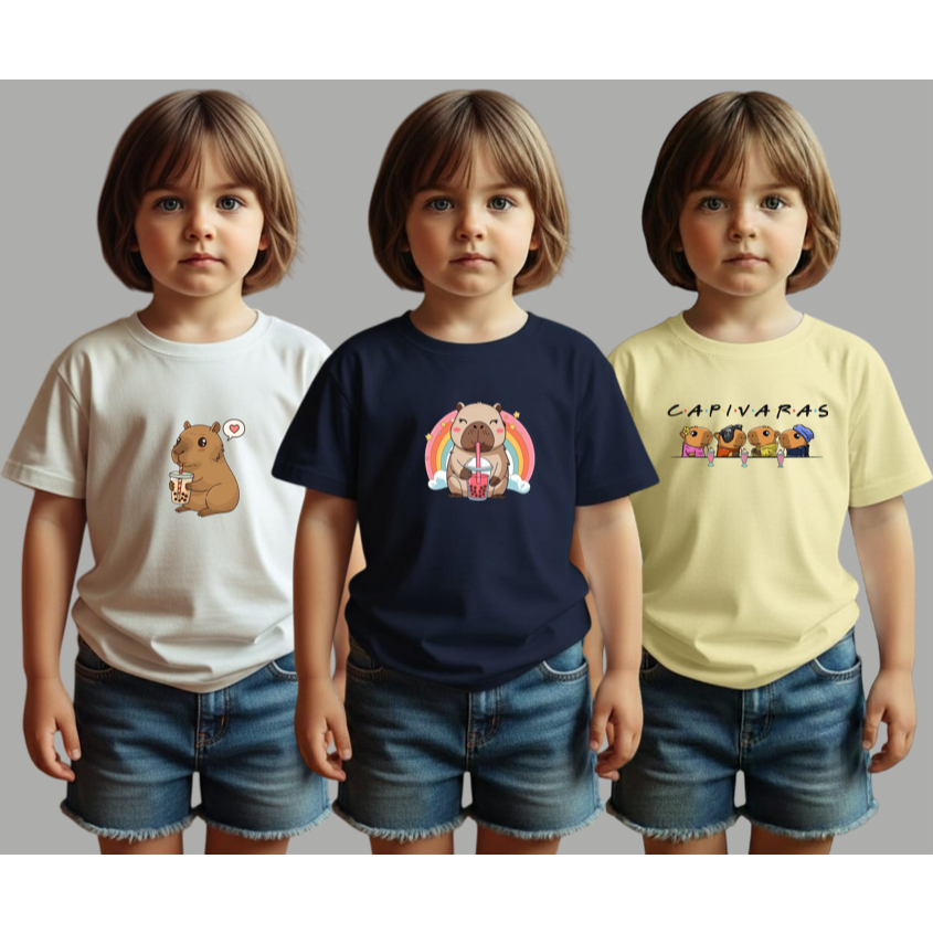 Kit 3 Camisetas Infantil Feminina Com Estampa de Capivara T-shirt 100% Algodão