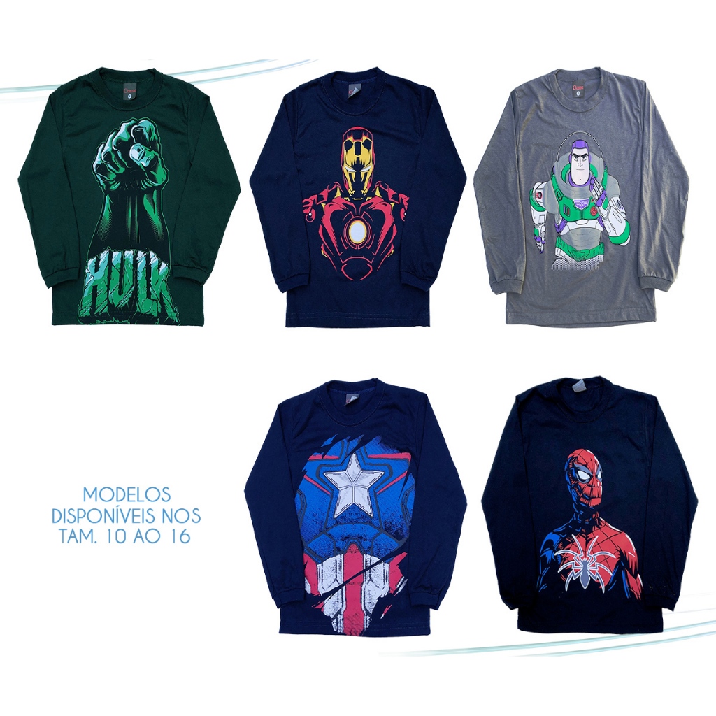 Kit 3 Camisetas Manga Longa Inverno Menino Personagem Heróis Juvenil 10 ao 16