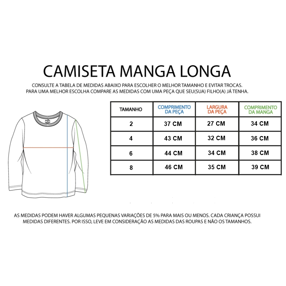 KIT 3 CAMISETAS MANGA LONGA PERSONAGENS SORTIDOS INFANTIL Camiseta manga longa infantil cobrem os braços até os pulsos, além de cobrir o torso da criança. São projetadas especificamente para crianças, com tamanhos, cortes e estilos que atendem às suas necessidades e preferências. Essas camisetas são frequentemente confeccionadas com materiais confortáveis e duráveis, adequados para o uso diário e para as atividades que as crianças realizam. Elas estão disponíveis em uma variedade de cores, estampas e designs, muitas vezes apresentando personagens de desenhos animados, filmes, programas de TV ou outros elementos atrativos para as crianças. As camisetas manga longa infantis são usadas principalmente em climas mais frios para manter as crianças aquecidas, mas também podem ser usadas como uma camada extra de roupa durante o ano todo, proporcionando versatilidade em diferentes condições climáticas. RECOMENDAÇÃO DE VESTIMENTA: TAMANHO 2 - Veste de 0 à 1 anos; TAMANHO 4 - Veste de 2 à 3 anos; TAMANHO 6 - Veste de 4 à 5 anos; TAMANHO 8 - Veste de 6 à 7 anos