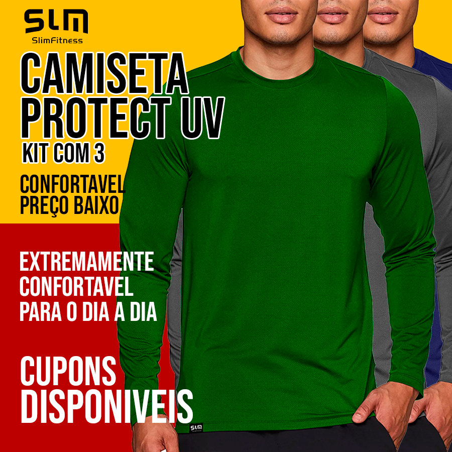 👕 KIT COM 3 CAMISETAS MASCULINAS TÉRMICAS A Camiseta UV Slim Fitness foi desenvolvida para quem busca proteção solar, conforto térmico e alto desempenho em atividades ao ar livre ou no dia a dia. Este kit contém 3 unidades, podendo ser cores sortidas ou combinações disponíveis no anúncio, conforme seleção no momento da compra. ☀️ PROTEÇÃO SOLAR EFICIENTE ✔️ Bloqueia mais de 99% dos raios UV-A e UV-B ✔️ FPU 50+ permanente (não sai com as lavagens) ✔️ Ideal para exposição prolongada ao sol 🏃 INDICAÇÕES DE USO - Piscina e praia - Trilha e pescaria - Caminhada e corrida - Academia - Atividades ao ar livre - Esportes na água (natação, hidromassagem) - Uso diário 🧵 CARACTERÍSTICAS DO PRODUTO - Modelo manga longa - Estilo segunda pele / térmica - Tecido leve, respirável e confortável - Secagem rápida - Excelente elasticidade e ajuste ao corpo - Não esquenta excessivamente - Gola redonda - Não amassa com facilidade 🧪 COMPOSIÇÃO 91% Poliéster + 9% Elastano 🧼 CUIDADOS COM O PRODUTO - Dispensa o uso de amaciante - Dispensa o uso de ferro de passar - Lavar normalmente à mão ou na máquina - Não usar alvejante 📦 CORES - Kit pode ser cores sortidas - Ou kits de cores conforme opções disponíveis no anúncio 📌 As cores não podem ser alteradas após a compra. 📏 MEDIDAS APROXIMADAS (Comprimento x Largura x Manga) - P: 61cm x 50cm x 46cm - M: 63cm x 52cm x 48cm - G: 65cm x 54cm x 50cm - GG: 67cm x 56cm x 52cm - EGG: 69cm x 58cm x 54cm 🔎 Recomendamos conferir a tabela de medidas antes da compra. 🏷️ INFORMAÇÕES ADICIONAIS Origem: Slim Fitness Fashion (nacional) Garantia: Contra defeitos de fabricação ⚠️ ATENÇÃO As fotos do anúncio são protegidas por direitos autorais Qualquer uso indevido das imagens está sujeito a medidas legais