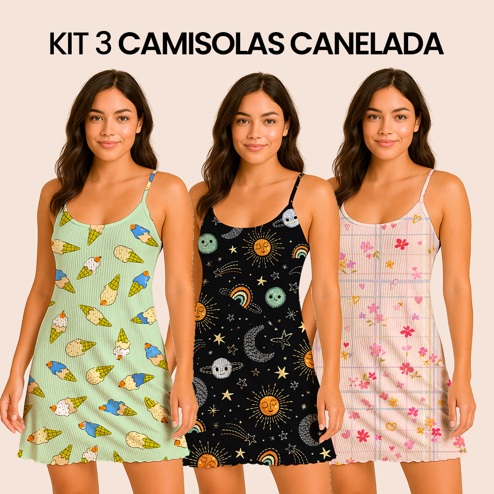 Kit 3 Camisolas Pijama Feminino Estampada Tecido em Suede Canelado - Tamanhos P, M, G, GG