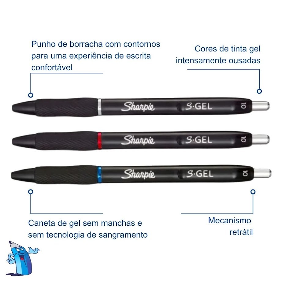 * ESCOLHA A COR NA OPÇÃO DE VARIAÇÕES E ADICIONE AO CARRINHO. * NÃO SERÁ POSSÍVEL MUDAR APÓS A FINALIZAÇÃO DA COMPRA. O QUE VOCÊ RECEBERÁ: 3X CANETA SHARPIE S-GEL PONTA MÉDIA 1.0MM RETRÁTIL - NAS CORES DISPONIVEIS: 3 AZUL, 3 VERMELHO, 3 PRETA OU 1 VERMELHA + 1 PRETA + 1 AZUL; Caneta Sharpie S-Gel - O poder de Sharpie está agora em uma caneta gel com a Sharpie S-Gel! Sem manchas, sem tecnologia de sangramento e com a melhor tinta ousada da categoria, esta caneta Sharpie oferece uma escrita sempre vívida. É uma caneta gel de alto desempenho com uma aparência elegante e profissional que a torna um instrumento de escrita que você não vai querer emprestar. E o punho de borracha contornado proporciona uma escrita confortável durante qualquer tarefa. DESCRIÇÃO DO PRODUTO: Marca: Sharpie Cores disponíveis: azul, vermelho e preto Caneta em gel • Caneta de gel sem manchas e sem tecnologia de sangramento • Cores de tinta gel intensamente ousadas oferecem uma escrita sempre vívida • Punho de borracha com contornos para uma experiência de escrita confortável • Ponta Grossa (1.0mm) ***** Quem Somos ****** Atuando na área do comércio varejista, especializado em material escolar e escritório. Iniciamos as atividades em 2005 e desde então nos dedicamos a oferecer produtos de qualidade e atendimento diferenciado a nossos clientes. * Produtos À PRONTA ENTREGA! * Suporte e auxílio a nossos CLIENTES! - Envio RÁPIDO! - QUALIDADE garantida!