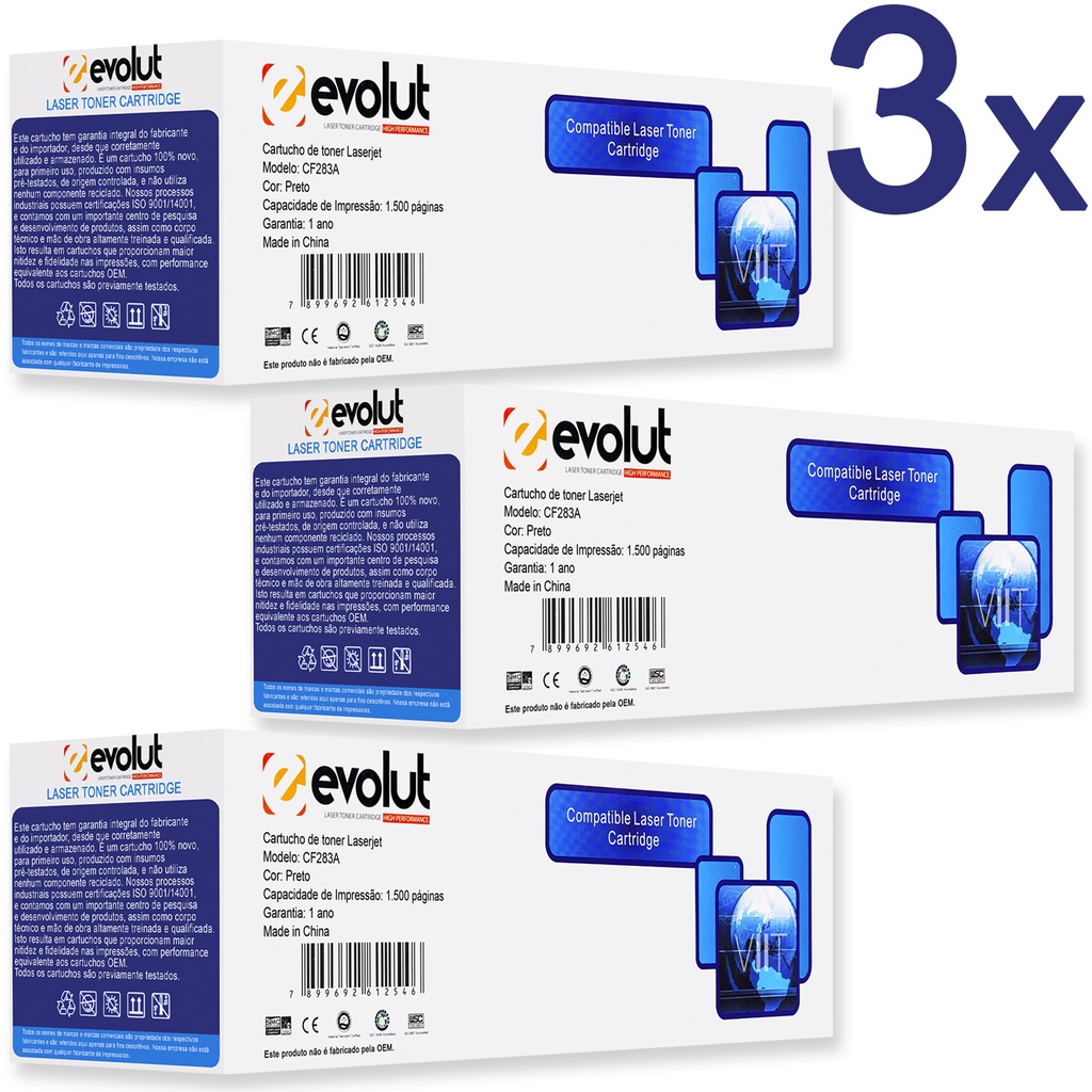 | Kit 3 Cartucho Toner 83A CF283A 283A Compatíveis Evolut c/ NF p/ La... este produto | R$ 134,96 | 20% | 4.8/5 | 1 |