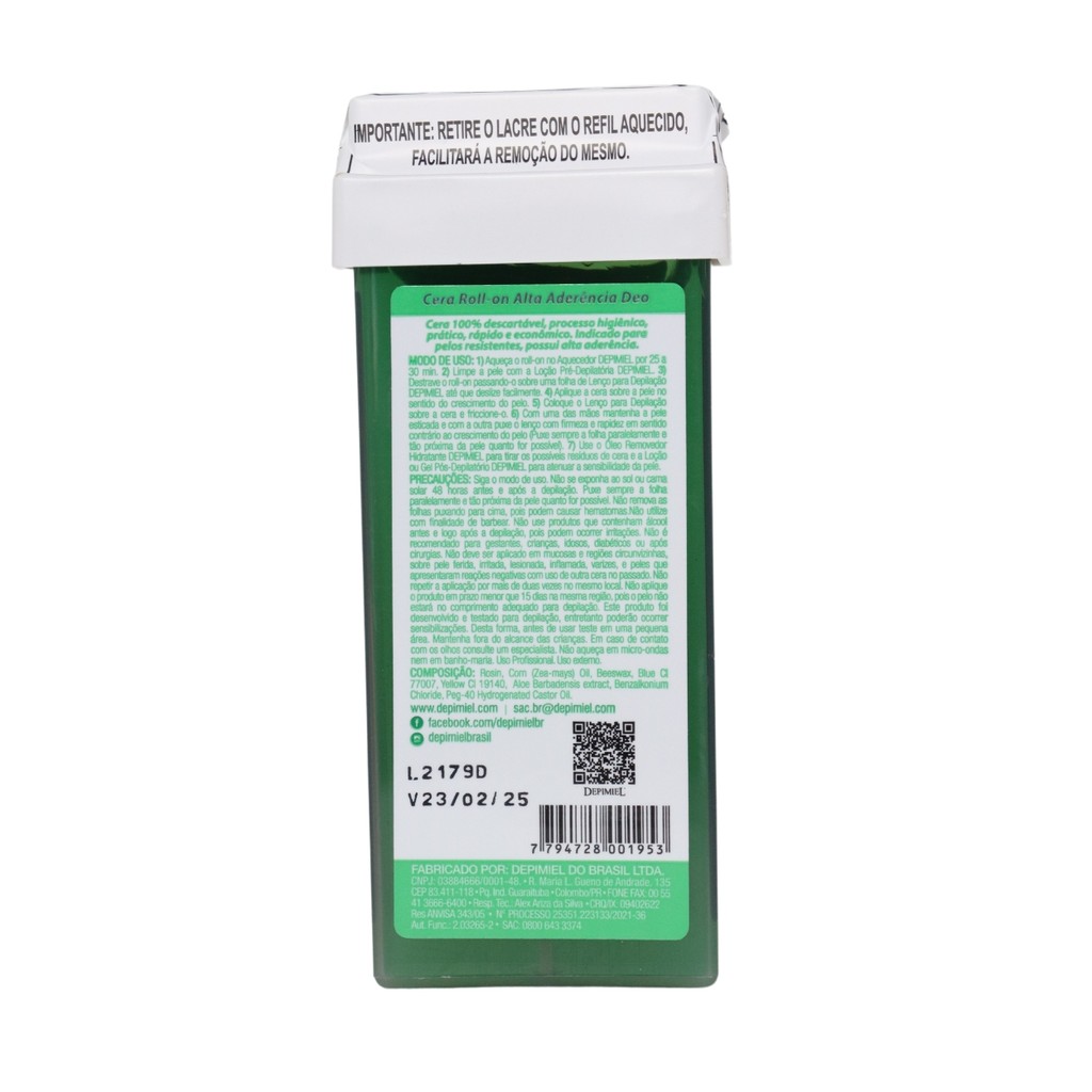 Oii, é um prazer ter você aqui! Descubra o Kit 3 Cera Roll-on Refil Depilatória Alta Aderência Depimiel, a escolha perfeita para quem busca praticidade e resultados profissionais em casa. Este kit foi especialmente desenvolvido para garantir uma depilação rápida, eficiente e de longa duração. O que é: - Kit com 3 Ceras Depilatórias Roll-on 100g; - Marca: Depimiel; - Não é Hidrossolúvel; - Para pelos mais resistentes; O que tem: - Aloe Vera; - Alta aderência; O que faz: - Hidrata; - Adstringe; Área de uso: - Corporal; - Peles normais; Como usar: 1- Aqueça o roll-on no aquecedor de cera roll-on. 2- Limpe a pele com a Loção Pré-Depilatória. 3- Destrave o roll-on passando-o sobre uma folha de Lenço Para Depilação. 4- Aplique a cera sobre a pele no sentido do crescimento do pelo. 5- Coloque o lenço para depilação sobre a cera e friccione-o. 6- Com uma das mãos puxe o lenço com firmeza e rapidez em sentido contrário ao crescimento do pelo (puxe sempre a folha paralelamente e tão próxima da pele quanto for possível). 7- Use o Óleo Removedor Hidratante para retirar os possíveis resíduos de cera e a Loção ou Gel Pós Depilatório Depimiel para atenuar a sensibilidade da pele. IMPORTANTE: - Não indicado aplicar em: Regiões Faciais: Buço, Barba, Nariz e Sobrancelhas. Regiões Íntimas Sensíveis. - Não é recomendado para gestantes, crianças, idosos, diabéticos ou após cirurgias. Desfrute de uma depilação de qualidade profissional em casa com o Kit 3 Cera Roll-on Refil Depilatória Alta Aderência Depimiel. Experimente e sinta a diferença na sua pele. Não perca tempo, adquira já o seu e diga adeus aos pelos indesejados! Surgiu alguma dúvida? Entre em contato com a gente! Boas Compras :)