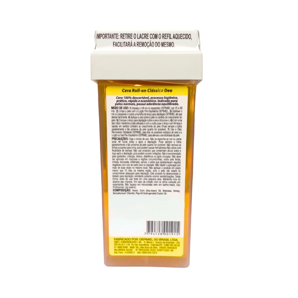 Oii, é um prazer ter você aqui! Buscando uma depilação eficaz e prática? O Kit 3 Ceras Roll-on Refil Depilatória Clássica Mel Depimiel é a escolha perfeita para uma pele lisa e bem cuidada. O que é: - Kit com 3 Ceras Depilatórias Roll-on 100g; - Marca: Depimiel; - Não é Hidrossolúvel; - Para pelos mais resistentes; O que tem: - Mel; - Alta aderência; O que faz: - Hidrata; - Nutre; Área de uso: - Corporal; - Pelos normais; Como usar: 1- Aqueça o roll-on no aquecedor de cera roll-on. 2- Limpe a pele com a Loção Pré-Depilatória. 3- Destrave o roll-on passando-o sobre uma folha de Lenço Para Depilação. 4- Aplique a cera sobre a pele no sentido do crescimento do pelo. 5- Coloque o lenço para depilação sobre a cera e friccione-o. 6- Com uma das mãos puxe o lenço com firmeza e rapidez em sentido contrário ao crescimento do pelo (puxe sempre a folha paralelamente e tão próxima da pele quanto for possível). 7- Use o Óleo Removedor Hidratante para retirar os possíveis resíduos de cera e a Loção ou Gel Pós Depilatório Depimiel para atenuar a sensibilidade da pele. IMPORTANTE: - Não indicado aplicar em: Regiões Faciais: Buço, Barba, Nariz e Sobrancelhas. Regiões Íntimas Sensíveis. - Não é recomendado para gestantes, crianças, idosos, diabéticos ou após cirurgias. Não perca a chance de transformar sua rotina de depilação com um produto de qualidade. Garanta já o seu kit e sinta a diferença! Surgiu alguma dúvida? Entre em contato com a gente! Boas Compras :)