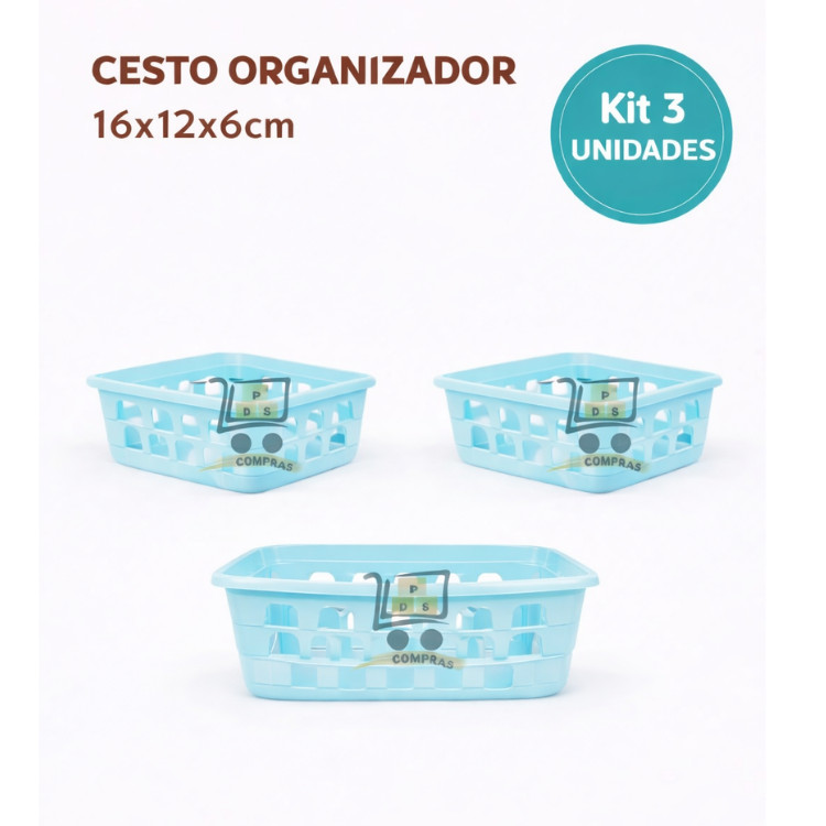 Kit 3 Cesto Organizador Multiuso Pequeno Azul 16x12x6cm Armario Gaveta Geladeira Banheiro Cozinha Lavandeira