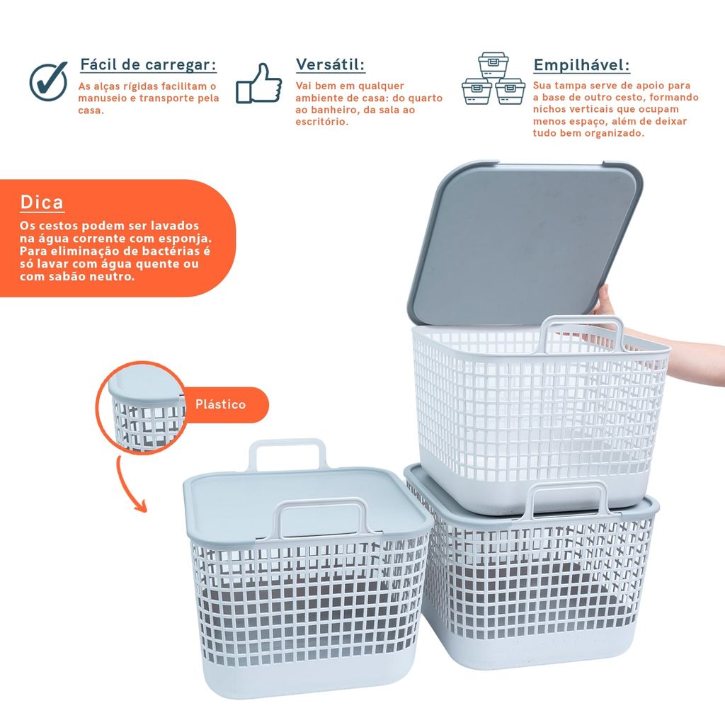 Kit 3 Cestos Telados com Tampa de Plástico 45l Cinza – Oikos