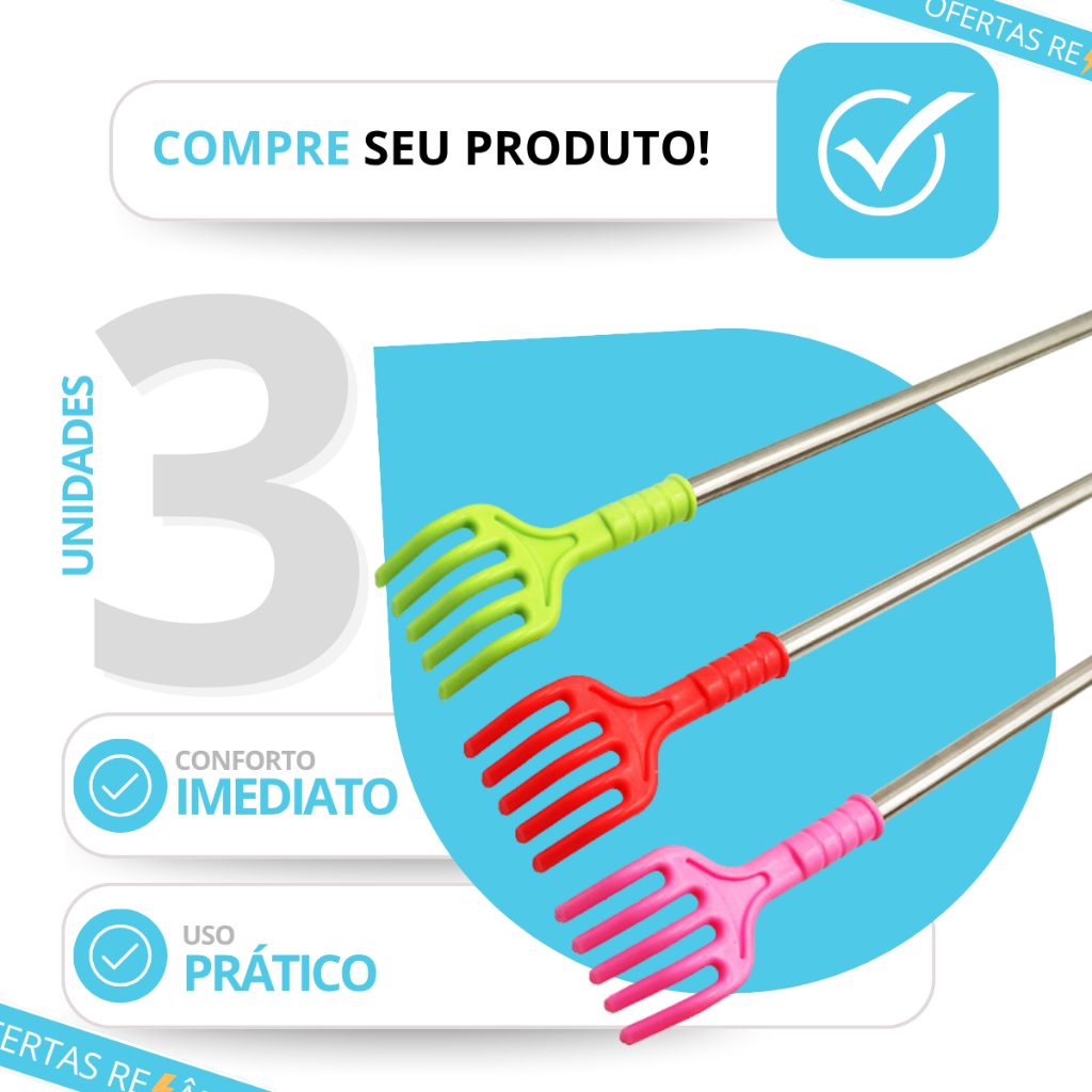 KIT 3 COÇADOR DE COSTAS E CABEÇA MÃOZINHA MASSAGEADOR EM METAL RESISTENTE – CABO FIXO PORTÁTIL, DURÁVEL E EFICIENTE PARA ALÍVIO IMEDIATO DA COCEIRA E RELAXAMENTO Alivie instantaneamente aquela coceira incômoda ou desfrute de uma massagem relaxante com o Kit 3 Coçadores de Costas e Cabeça Mãozinha em Metal Resistente. Projetado para proporcionar conforto e praticidade, o conjunto conta com hastes fixas e ponta anatômica tipo mãozinha, permitindo alcançar até as áreas mais difíceis das costas e do couro cabeludo. Ideal para o dia a dia, escritório, casa ou viagens. Feito em metal durável e leve, garante longa vida útil e excelente resistência, sendo uma ótima opção para quem busca bem-estar e praticidade em um só produto. → Conteúdo da Embalagem • Quantidade escolhida no momento da compra (modelo mãozinha, cabo fixo em metal) → Benefícios e Diferenciais • Alívio Instantâneo – Ideal para coçar costas, cabeça e áreas de difícil acesso. • Função Massageadora – Estimula a circulação e ajuda no relaxamento corporal. • Material Resistente – Produzido em metal leve, durável e anticorrosivo. • Design Anatômico – Formato de mãozinha com bordas suaves e seguras. • Portátil e Prático – Perfeito para levar na bolsa, carro ou escritório. • Uso Pessoal ou Presente Criativo – Item divertido, útil e funcional. → Informações Técnicas • Tipo: Coçador de costas e cabeça • Material: Metal resistente • Cabo: Fixo (não retrátil) • Quantidade: 3 unidades • Tamanho aproximado: 46cm x 3,8cm • Cor: Variada conforme o lote • Indicação: Uso pessoal, doméstico ou terapêutico leve – DÚVIDAS FREQUENTES RESPONDIDAS 1 – É resistente ou entorta fácil? ✅ É feito em metal de alta resistência, durável e firme, não entorta com facilidade. 2 – Serve para coçar cabeça também? ✅ Sim! Pode ser usado tanto no couro cabeludo quanto nas costas e ombros. 3 – O cabo é retrátil? ✅ Não, é fixo, garantindo mais firmeza e durabilidade no uso. 4 – É leve para transportar? ✅ Sim! Leve, compacto e fácil de guardar em qualquer lugar. 5 – O envio é rápido? 📦 Sim! Enviamos em até 24h úteis após a confirmação da compra. Pedidos feitos até 12h30 geralmente saem no mesmo dia!